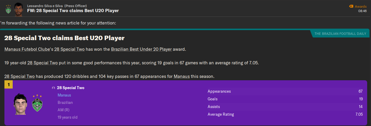 Спешал Ту стал лучшим бразильским игроком в возрасте до 20 лет, напомню, что в прошлый раз награду выигрывал Жман, а это уже уровень.