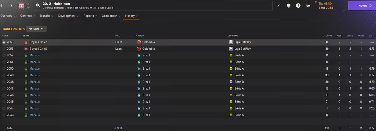 01.01.2054 21 Hakkinen 26 лет 169 игр 3 гола -------->  Boyaka Chico 30k + 20% с профита от перепродажи
