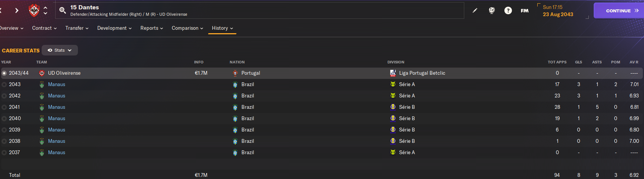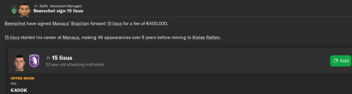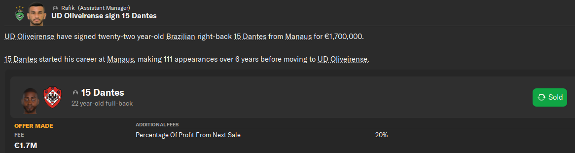 В отличии от Вальтера и Рима покупатель на Дантеса нашелся довольно быстро. Португальский Оливейренсе заплатил 900к сразу и 800к в рассрочку. Ну и 20% с профита от перепродажи мы получим.
