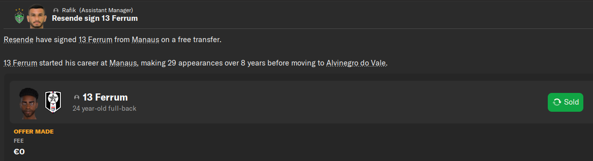 В свое время Феррум даже был у нас в ротации, но потом проиграл конкуренцию Луиджи и Джобсу. Прошлый сезон сидел в дубле, так что логично, что Любко с радостью отпустил 24-летнего ненужного игрока. Подсуетился Ресенде из Серии С. У левого защитника 29 матчей за Манаус и 1 гол.