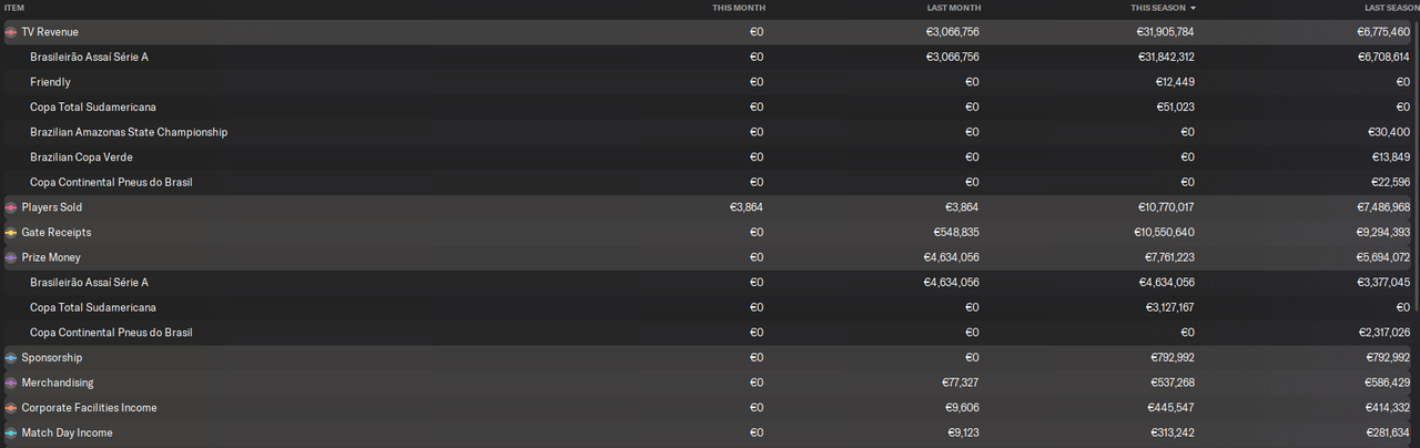 Да, для первого захода результат просто отличный, как и весь сезон :good: Уже есть на чем строить базу. Вспоминая свой ноу-трансферс с Вилья Дальмине я довольно долго топтался потом в середине таблицы, перед тем как совершить рывок к призовым местам. Полагаю Манаус тоже в ближайшие годы ожидает что-то подобное, но тут самое главное, что можно спокойно обрастать жирком, а Бразилия по финансам совсем не Аргентина, один ТВ контракт чего стоит. В принципе это идеальный момент чтобы попробовать взять Судамерикану. Кампане это в свое время удалось в схожих обстоятельствах.