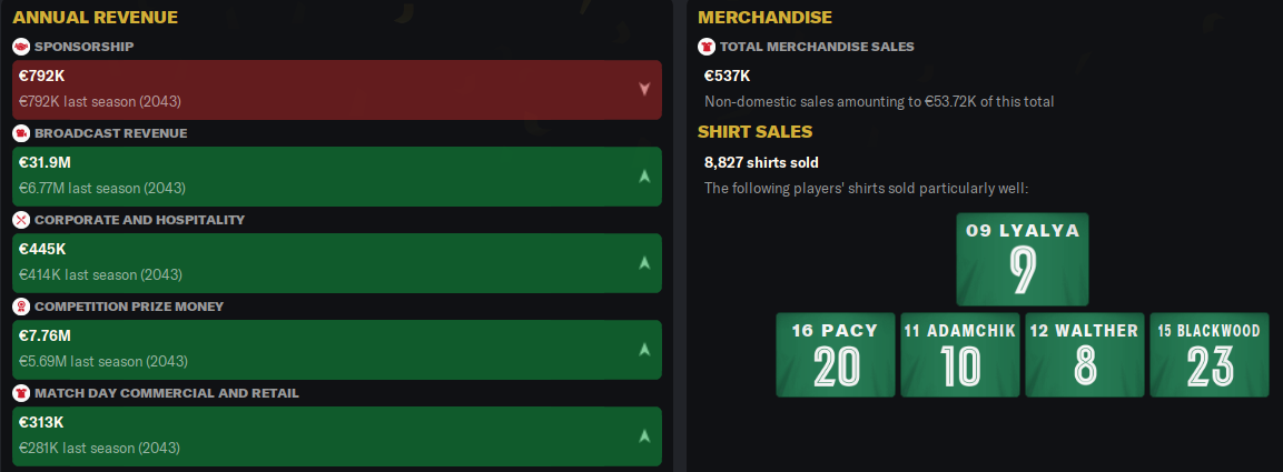 Еще по десятке имеем с билетов и продаж игроков и 7 миллионов в виде призовых. Доходы со спонсорства и продаж футболок выглядят на этом фоне просто смешными.