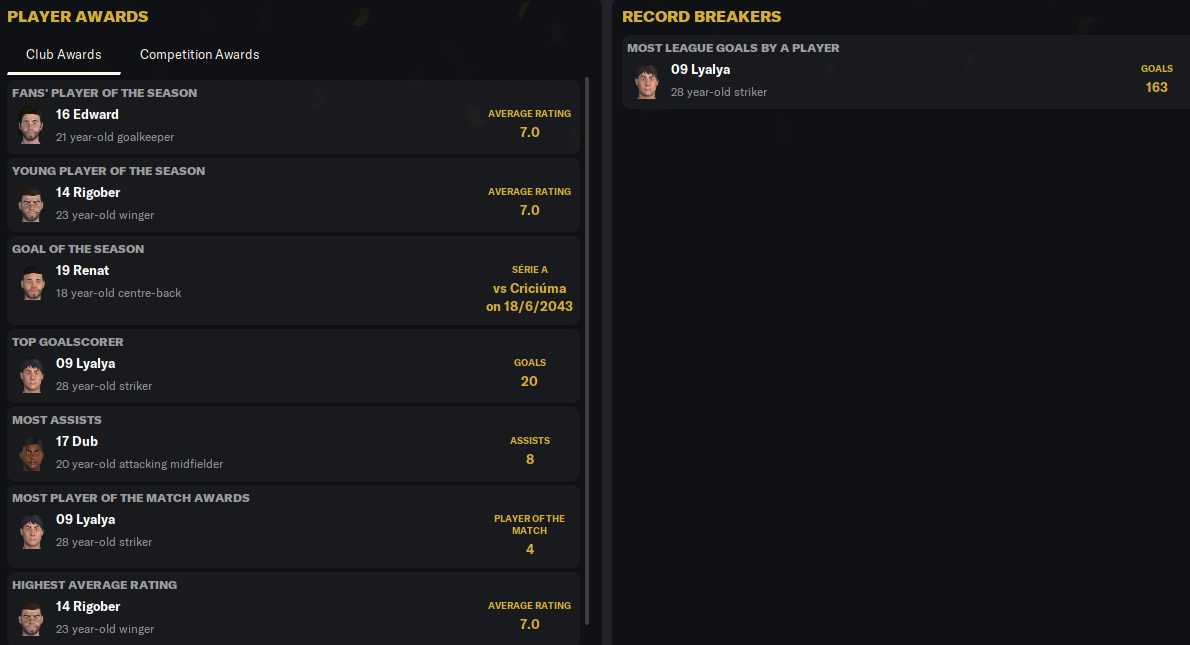 Лучший бомбардир - Ляля с 20 голами. Выглядит неплохо, но в Серии А голов было только 9, в Судамерикане - 3. Про Лялю тоже чуть позже будет пара слов, пока же только отмечу, что теперь у него 163 мяча за Манаус. Лучший ассистент неожиданно Дуб, который был скорее игроком замены, но прекрасно себя проявил и в следующем сезоне может вполне побороться за основу.
