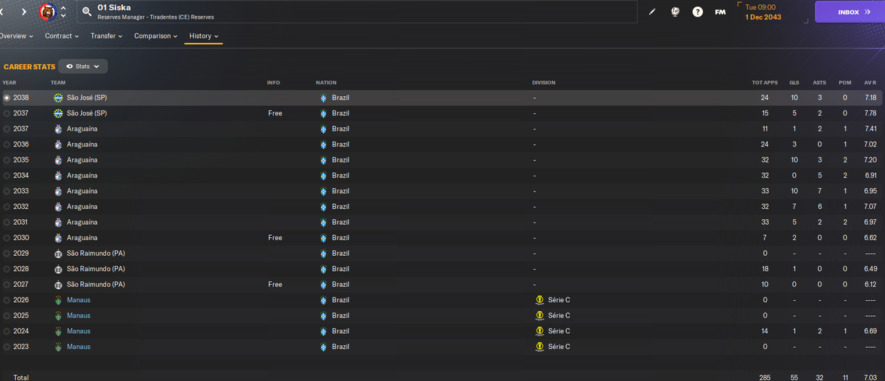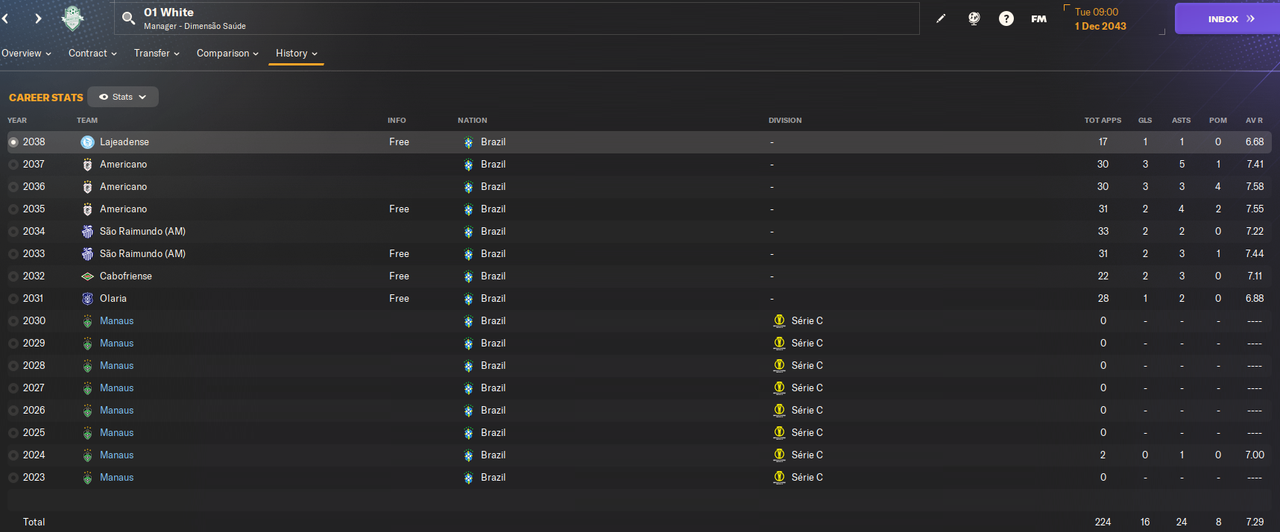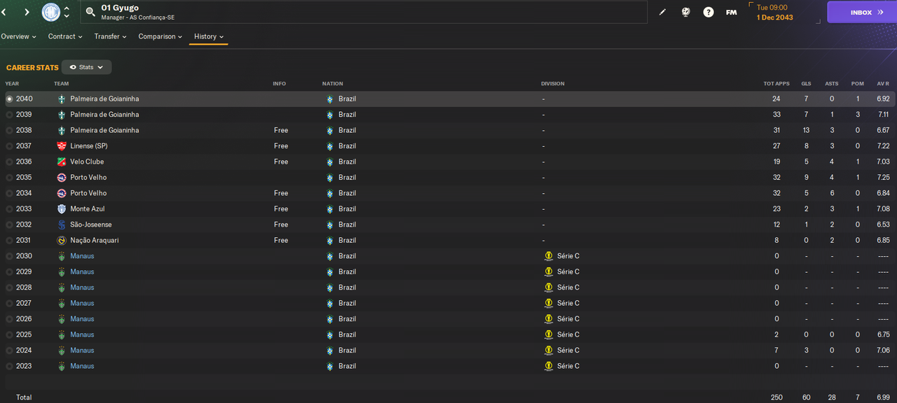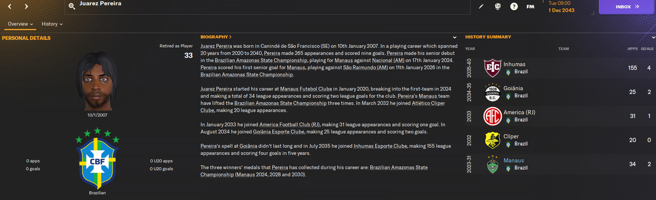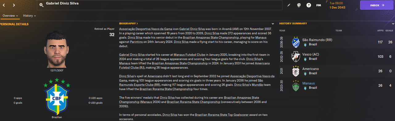Тут истории игрока не сохранилось, но каких-то высот опорник не достиг. За Манаус у него только 9 матчей, в 23 года ушел на фри и играл после этого только за команды из низших лиг. Когда именно закончил карьеру сейчас уже непонятно. Из футбола ушел окончательно.