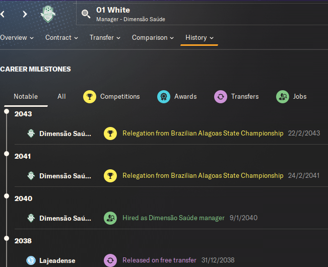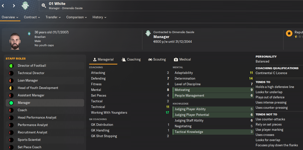 В 38-ом Вайт закончил карьеру игрока и стал тренером. В 2040-ом получил свое первое назначение - в Dimensao Saude. Зато сразу менеджером. Там он до сих пор, хотя дважды занимал последнее место в чемпионате своего штата.