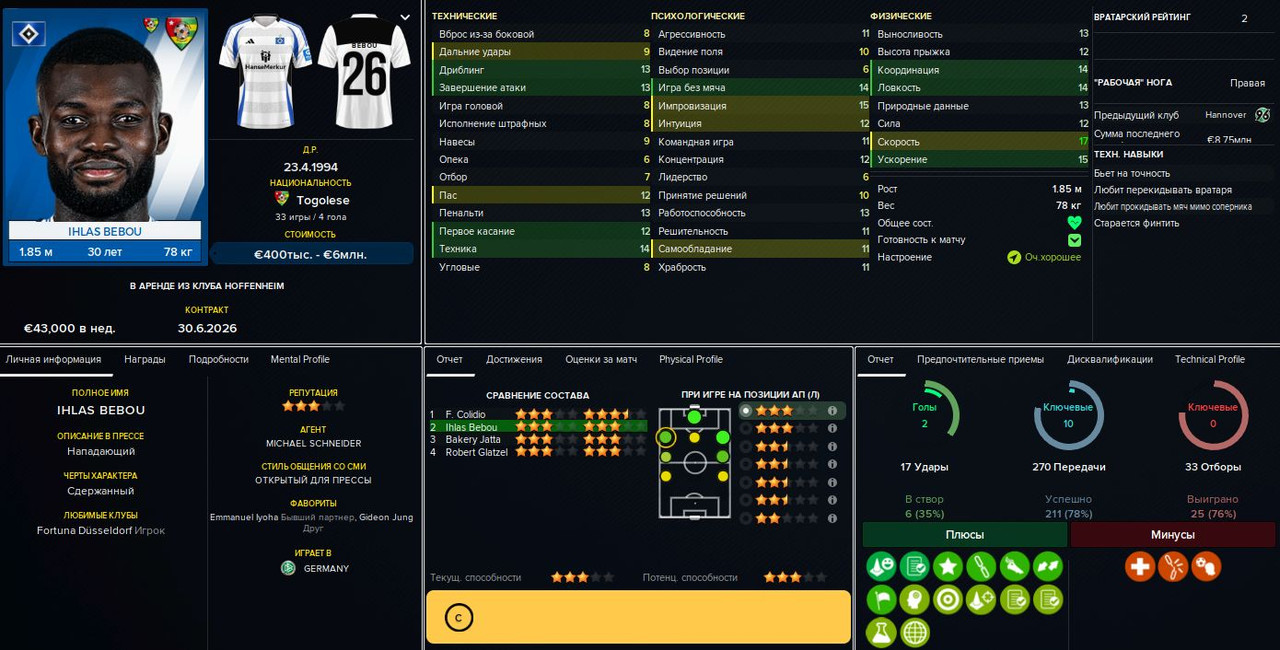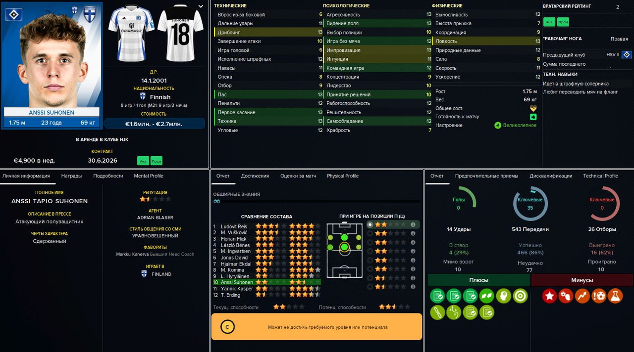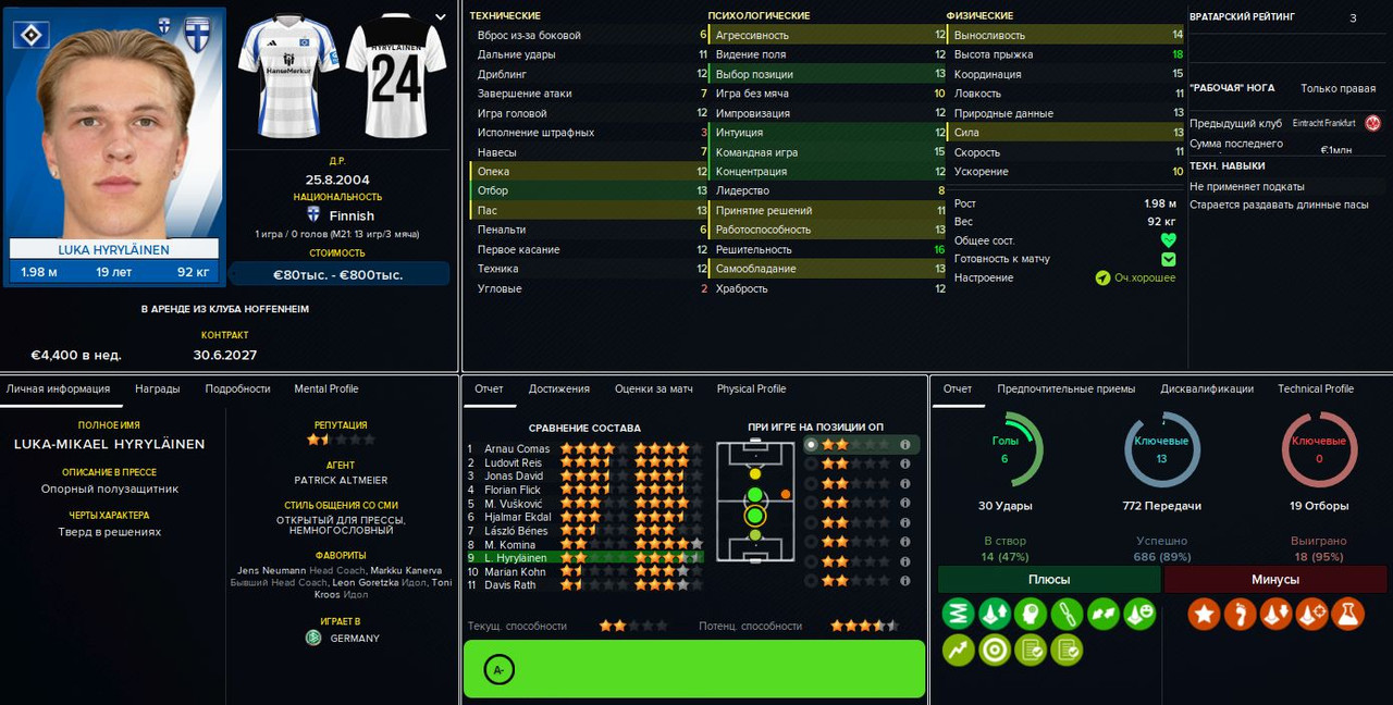 Среднюю оценку финну приподняли забитые мячи (особенно победный во втором раунде кубка), в остальном же он был неплох, но не более того. Я не стал включать в договор аренды право выкупа (меньше миллиона евро), сперва жалел об этом, но теперь рассматриваю это разве что как потенциально упущенную прибыль: на новый уровень Лука нас вряд ли выведет, а глубины состава в полузащите у нас и без него на следующий сезон должно хватить.