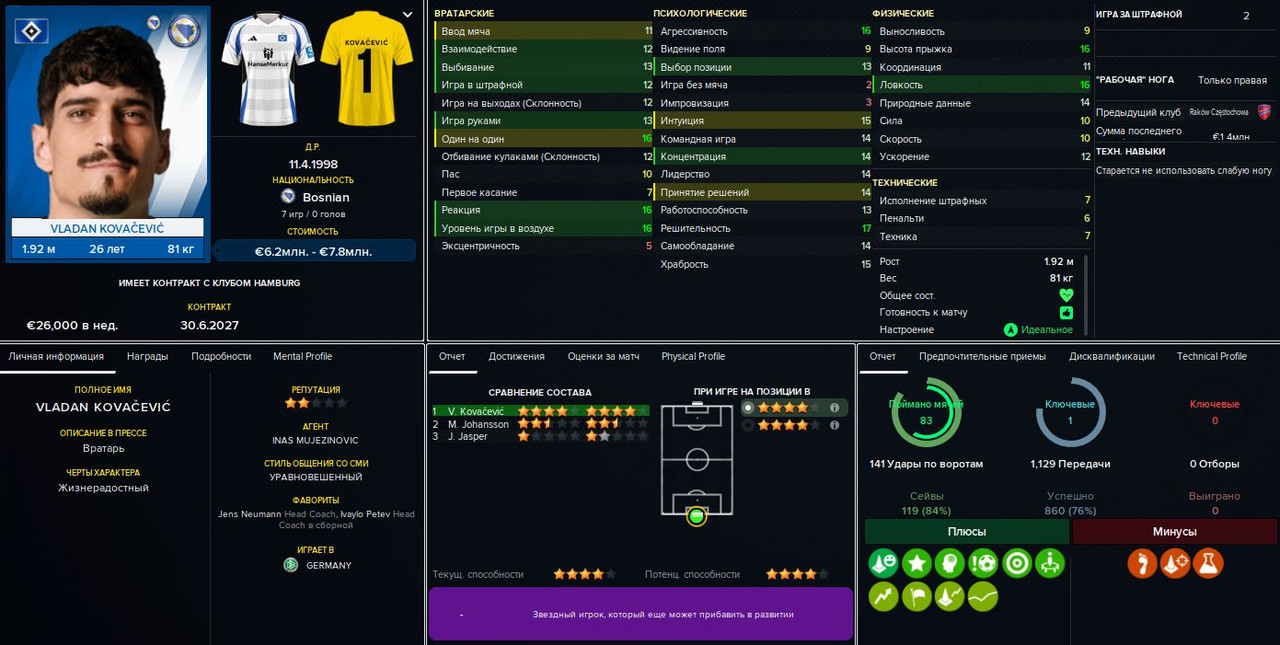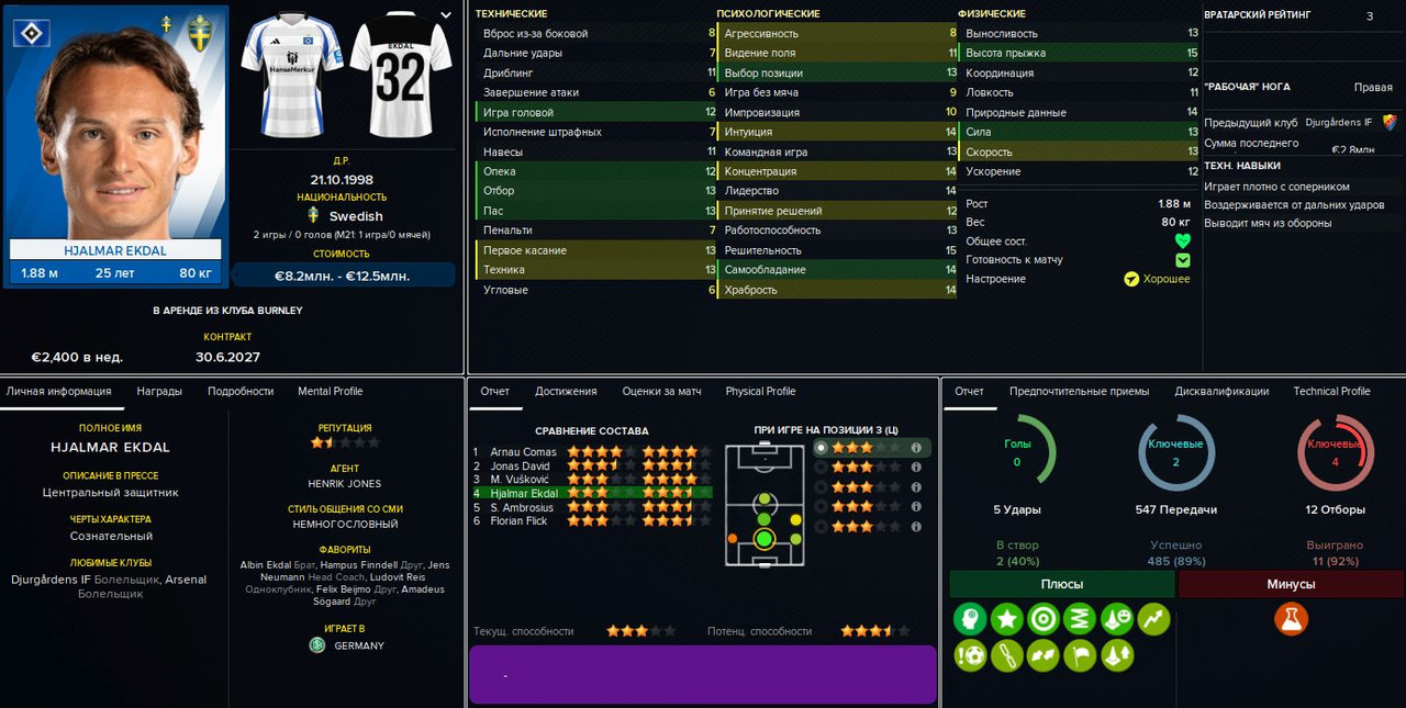 30(3) игр, 2362 минуты, 0+0 (0.34 xG, 1.84 xA), 4.80 прх/90, 2.82 отб/90, 2.93 обв/90, оценка 6.94.