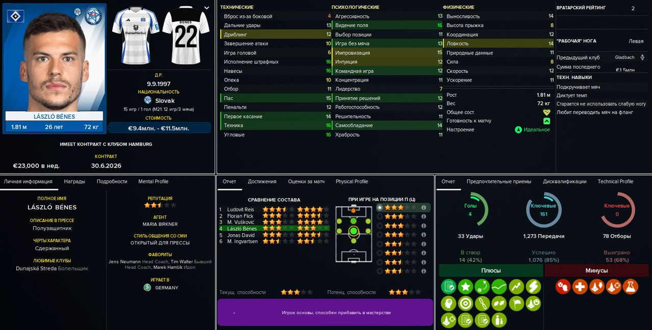 Перевод на более атакующую роль пошёл словаку на пользу: к традиционно опасным подачам со стандартных положений добавились и результативные действия в последней трети. Тем не менее, в больших матчах, где стандартов меньше, а оборонительно работы больше, Ласло далеко не так полезен. С учётом упирания в потолок собственных возможностей, средненького характера и запросов на «жирный» контракт, я всерьёз рассматриваю вариант с его продажей летом.