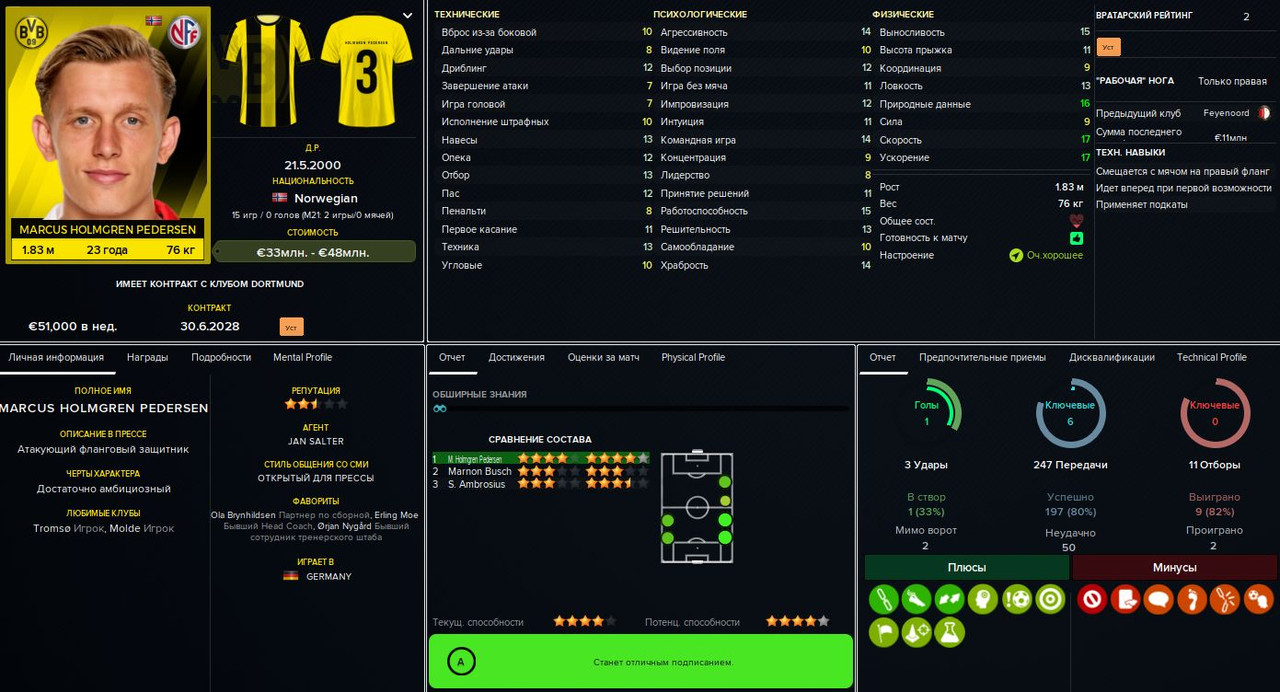 Против гостевой схемы 5-2-1-2 с активными латералями и парой форвардов (Макс Байер и норвежец Ховард Нильсен), которые на двоих забили в чемпионате 27 голов, я сыграл осторожно. Мы снова использовали двух опорников, а без мяча «садились» в 6-3-1. Но всё же четвёртый подряд «сухарь» Фернандишу обеспечили не только его реакция и внимательная игра обороны, но и доля везения в виде каркаса ворот.