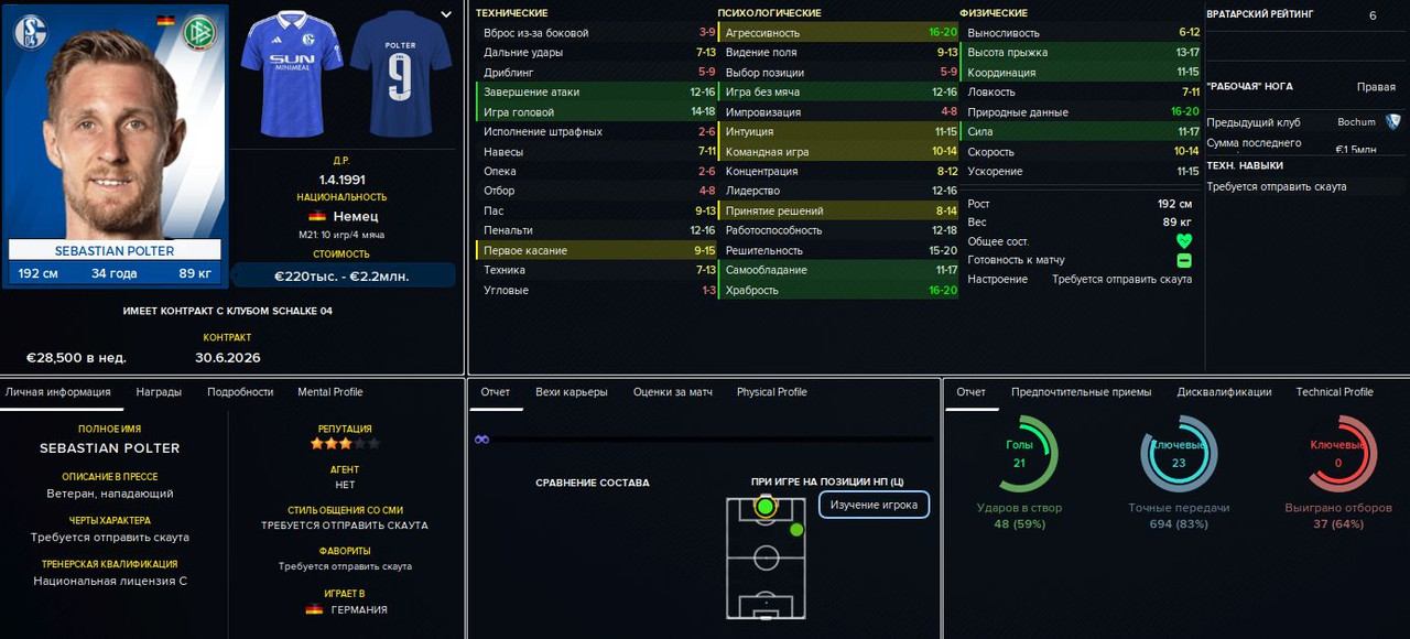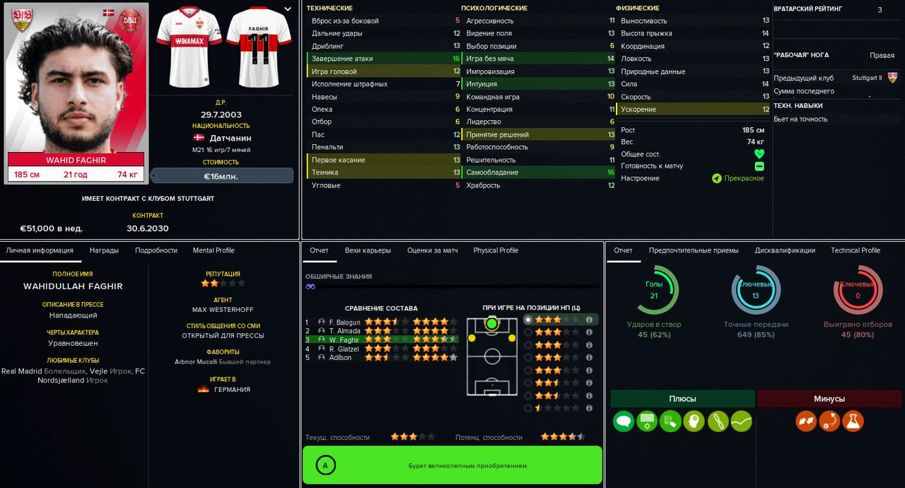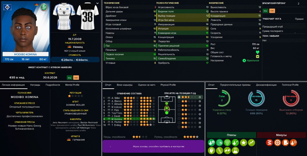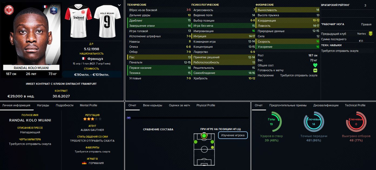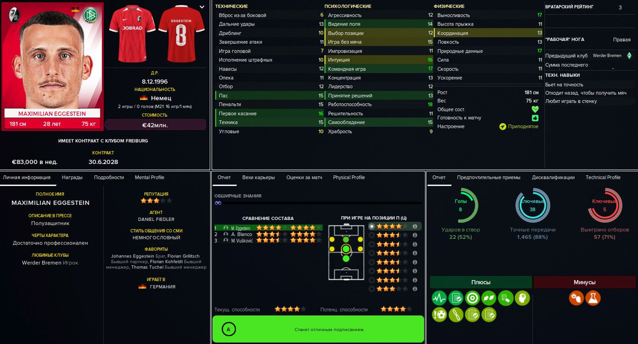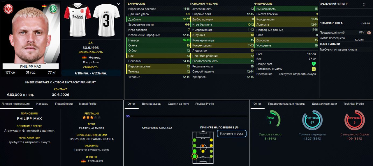 Тимоте Пембеле («Фрайбург»), 23 млн евро. После некоторых раздумий решил принять предложение «Фрайбурга». Француз хорош, но всё же не будущая звезда — это только на мой взгляд, а вот Глацелю (и ещё паре игроков) продажа такого сильного футболиста не понравилась. Я, естественно, пообещал укрепить позицию правого защитника (что и сделал буквально сразу), но всё равно получил полугодичный дебафф на мораль для нашего капитана и тех, кто его поддержал.