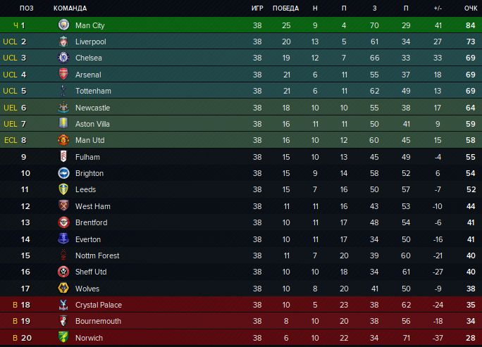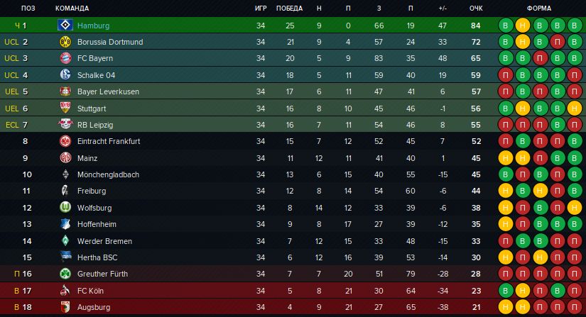 К неожиданностям, помимо нашего чемпионства, можно отнести успех «Шальке», пробившегося аж в Лигу чемпионов, и «Штутгарта». «Бавария» последний раз так плохо выступала в сезоне 2010/11, когда также набрала 65 очков и тоже финишировала третьей. «Айнтрахту» не хватило места в еврокубковой зоне. «Кёльн», избежавший вылета год назад благодаря отличной игре на финише, в этот раз совершить чудо не смог и таки пройдёт «очищение пердивом». После годичного отсутствия в Бундеслигу возвращаются «Бохум», обыгравший «Гройтер» в стыковых матчах (2:1; 2:2), а также берлинский «Унион». Ещё одним новичком станет «Арминия».