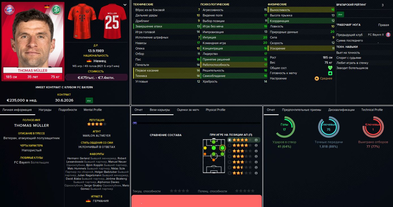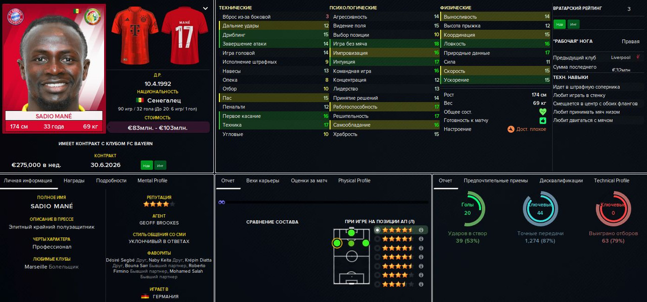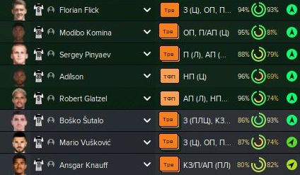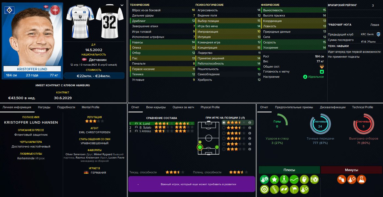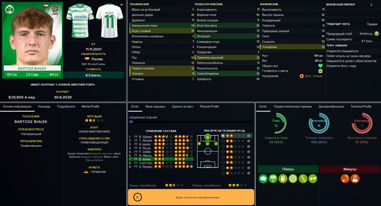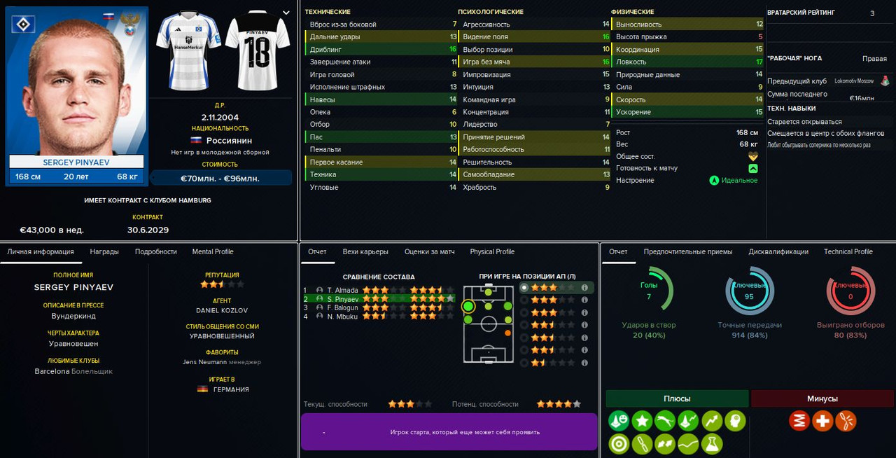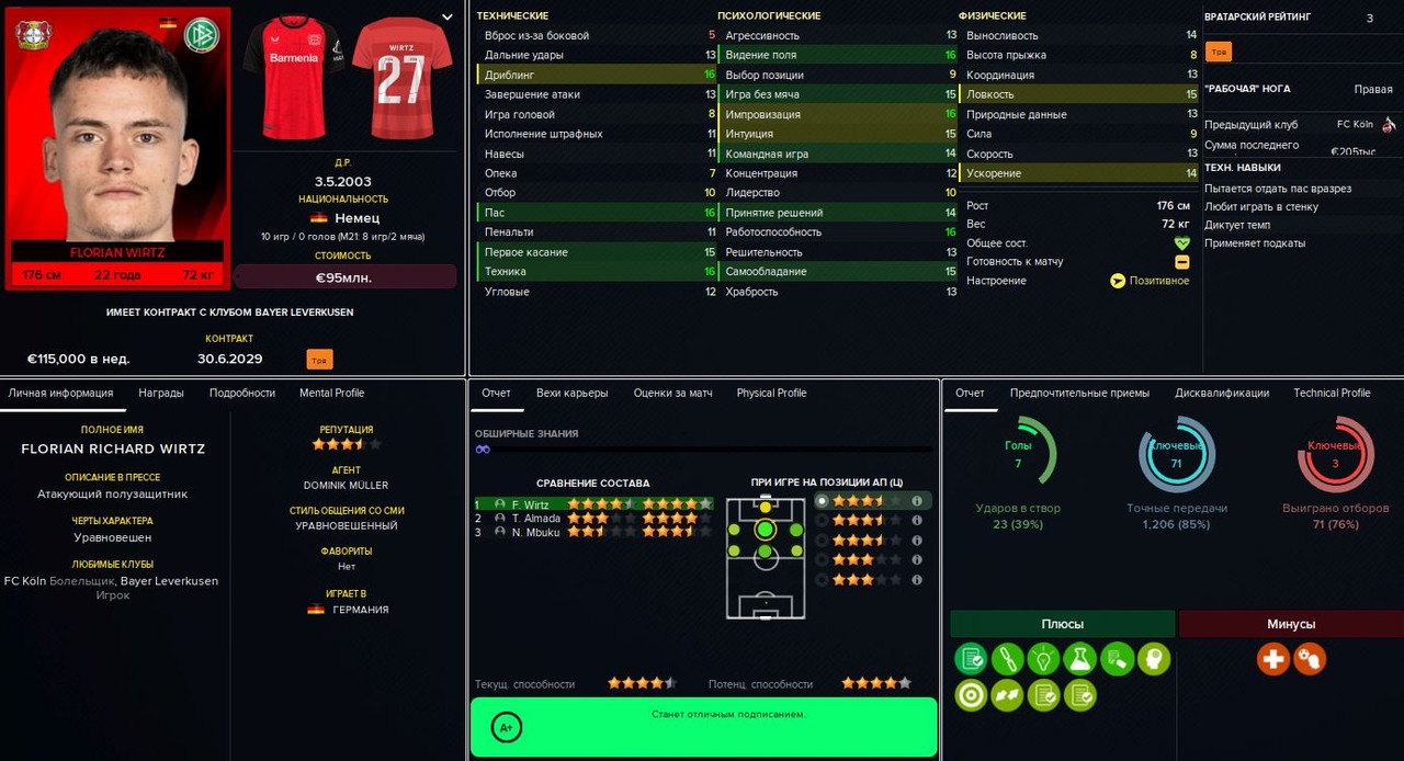 Базовой остаётся схема 4-3-3 (а также её более осторожный вариант с Балоганом или Мбюкю на острие). Это уже FM24, так что правому защитнику (Шутало/Амброзиус) можно выдать роль полуфлангового и, соответственно, развязать руки левому (Винья/Козза/Фишер). В центре поля можно варьировать роли: чистый разрушитель (Флик/Комас), статичный плеймейкер (Штиллер/Комина), «набегатель» в штрафную (Вушкович/Бланко) или классическая «десятка» (Юсуф/Альмада), которую можно передвинуть на позицию «под нападающим» в схеме 4-2-3-1. Справа в атаке — либо классический вингер (Кнауфф/Пиняев), либо левоногий Мбюкю. Слева — инсайд Балоган или ПКП-созидатель (Альмада/Пиняев).