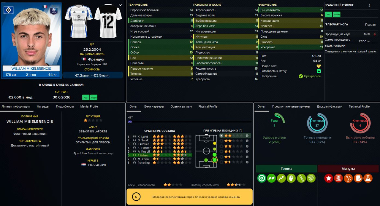 Вийям МИКЕЛЬБРАНСИС («Камбюр», Нидерланды), 34 игры, 2923 минуты, 1+3 (0.55 xG, 4.67 xA), оценка 6.75. Не понимаю, что нужно этому парню для прогресса. Да, «Камбюр» — не элитный клуб в смысле тренировочной базы и прочего, но два сезона в качестве игрока старта в Эредивизи — отличная возможность для роста. А на выходе — пшик.