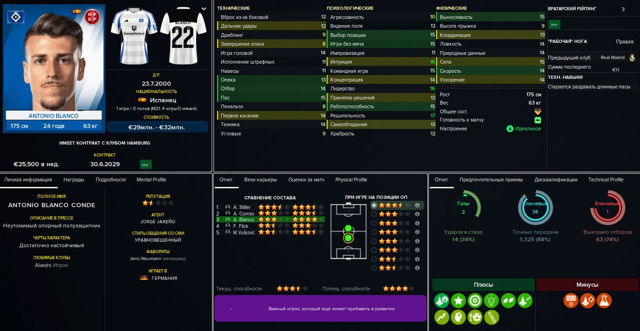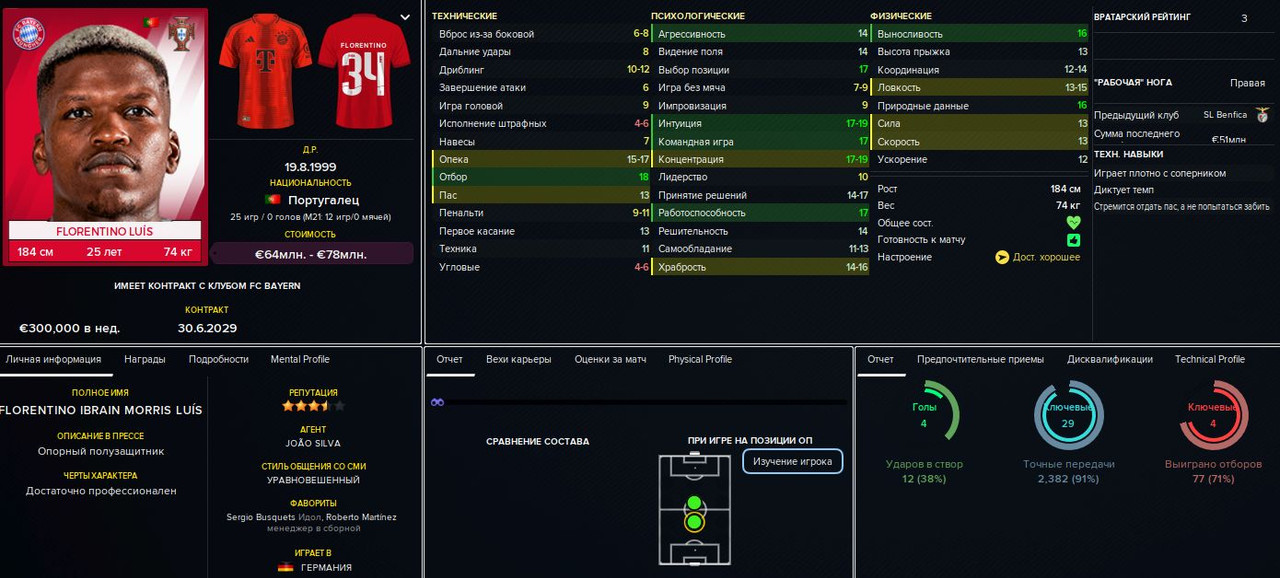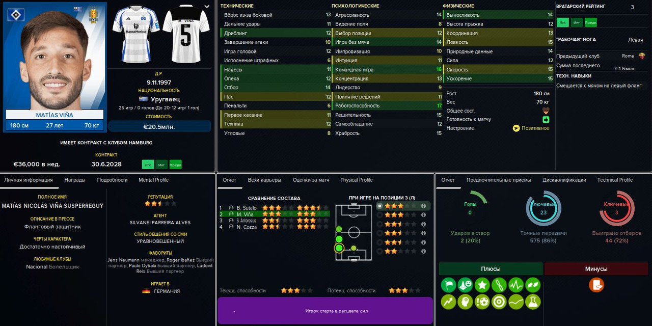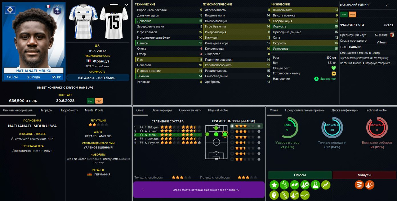 31(7) игра, 2737 минут, 2+0 (1.63 xG, 1.08 xA), 1.58 прх/90, 2.53 отб/90, 0.30 обв/90, оценка 6.93.