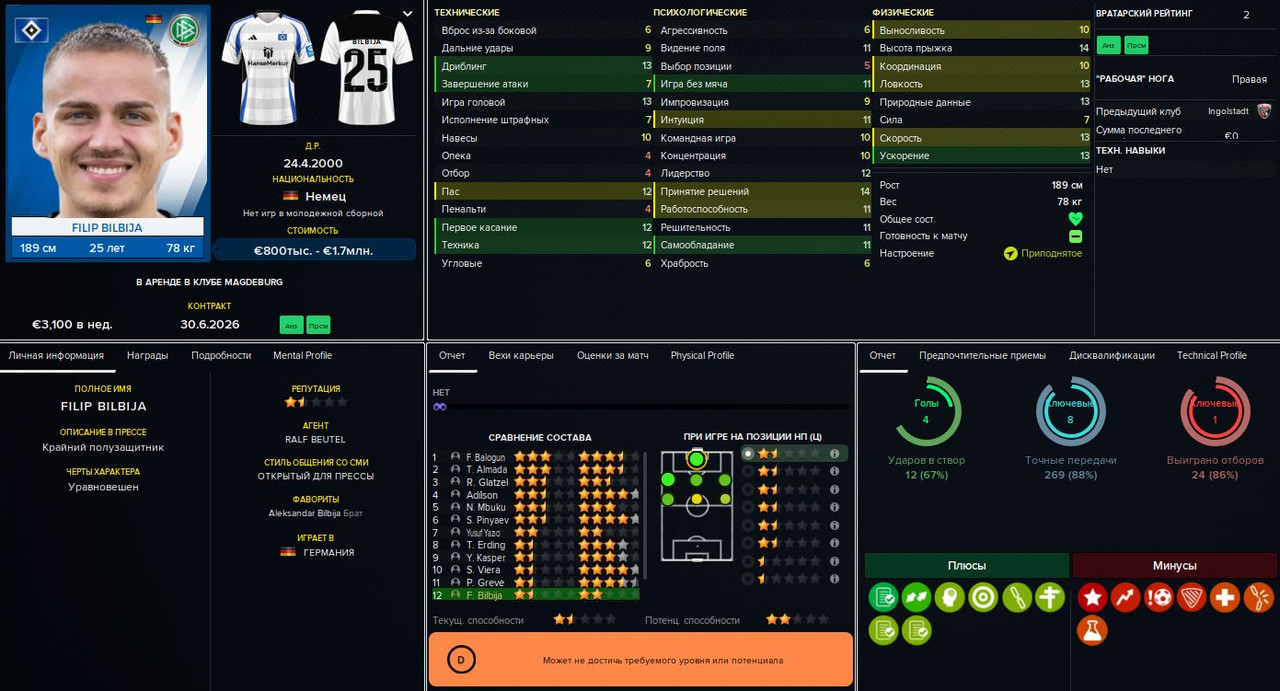 Филип БИЛЬБИЯ («Магдебург»), 9(14) игр, 988 минут, 4+1 (3.53 xG, 0.82 xA), оценка 6.91. Лишившись места в основе «Магдебурга», прогресса не добился.