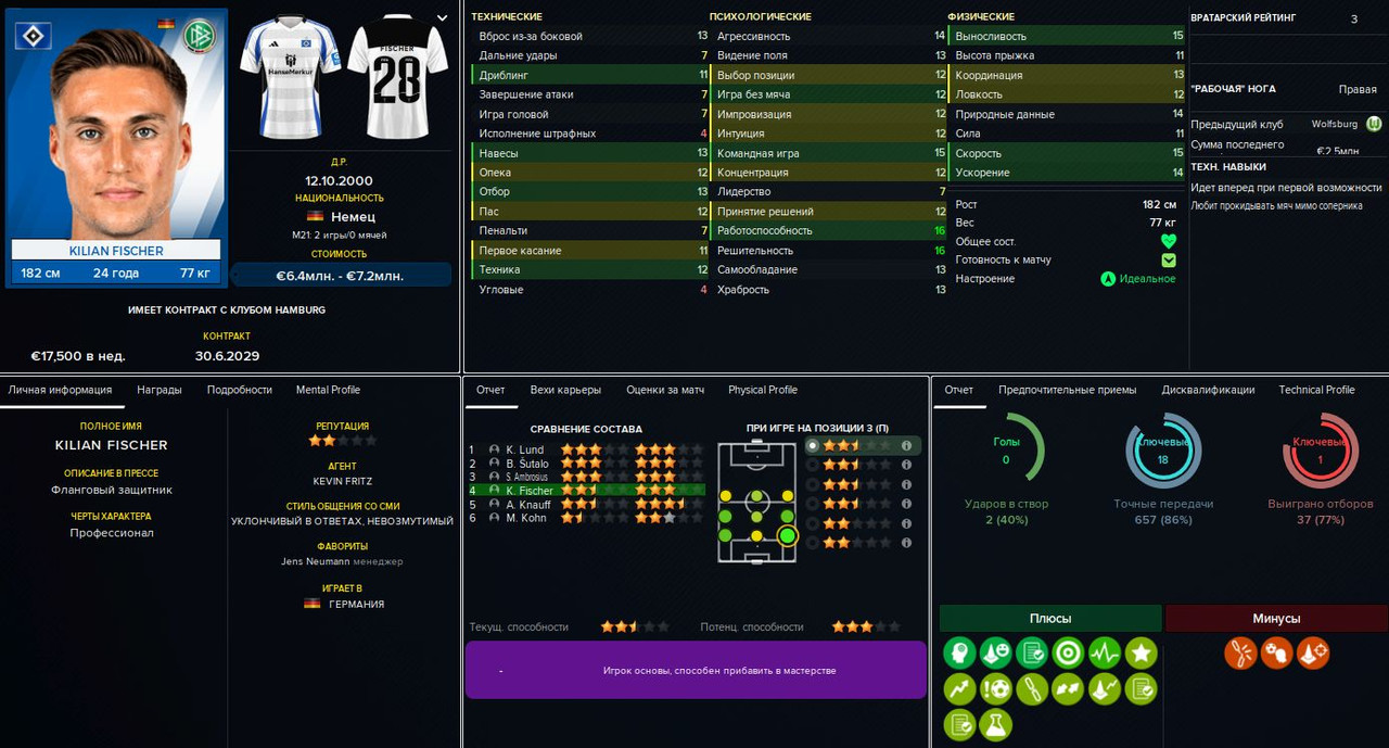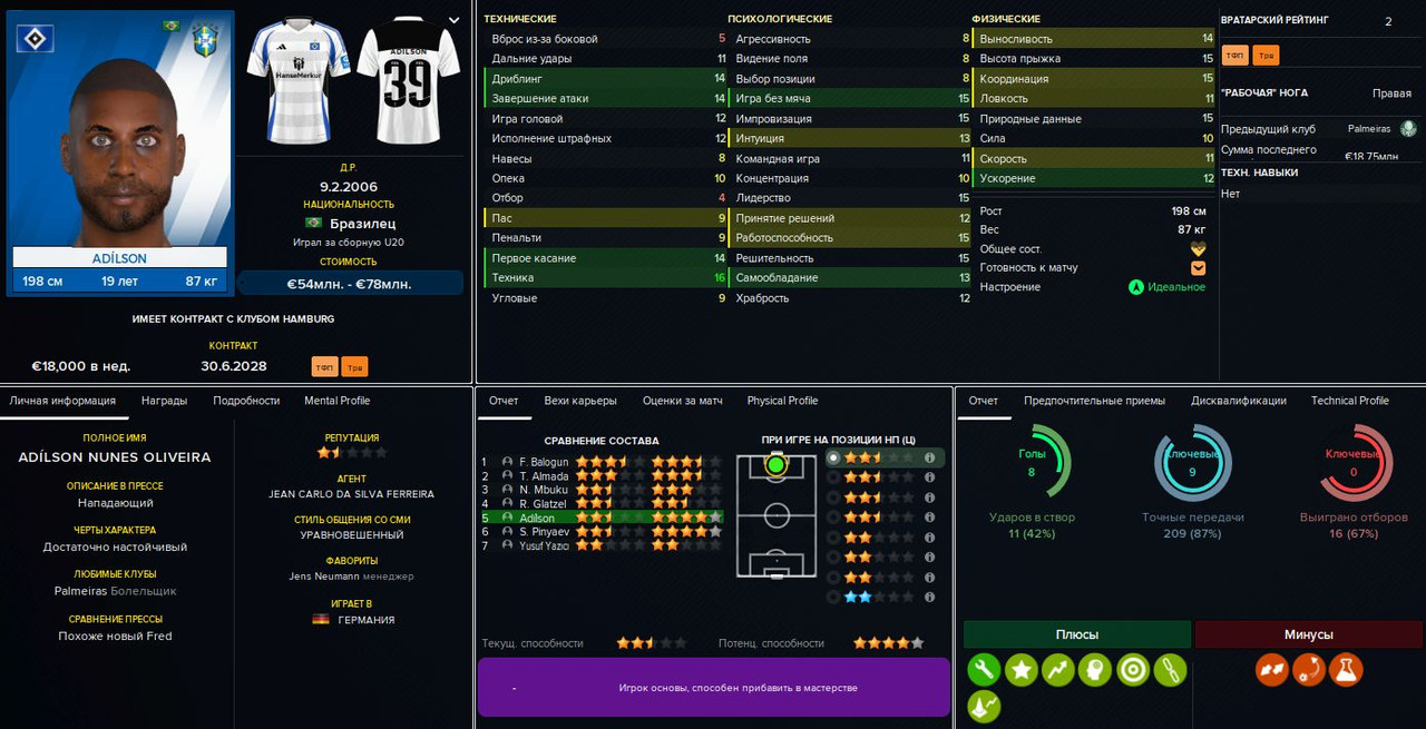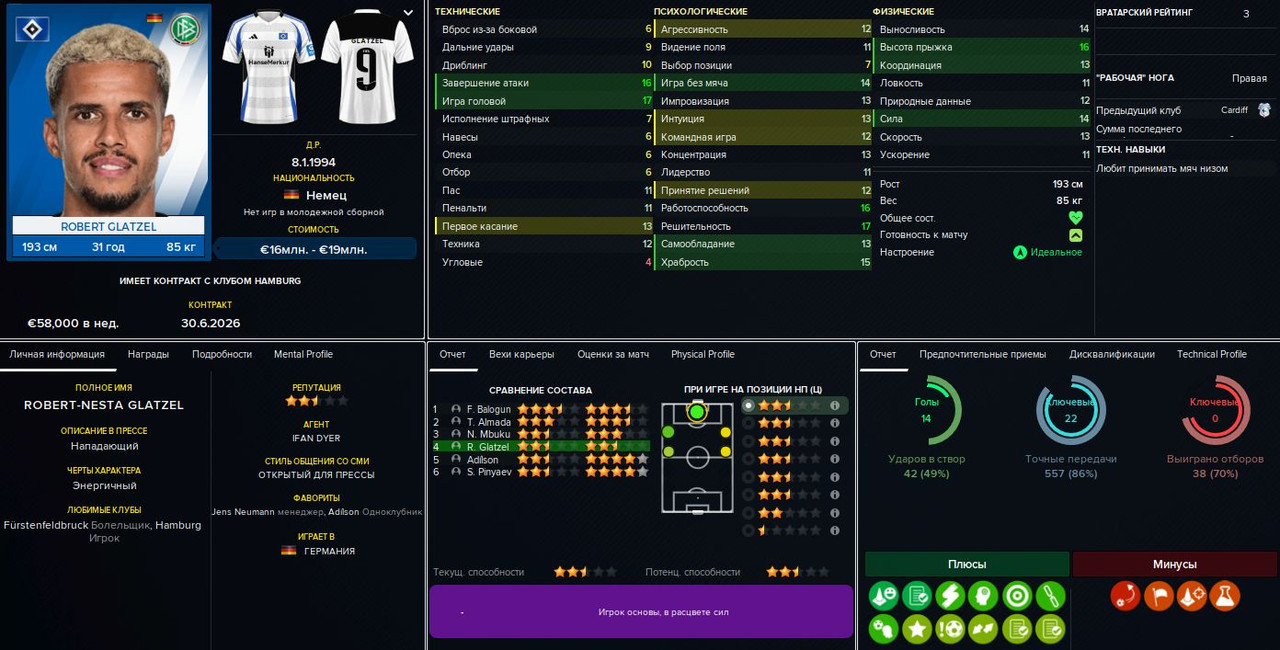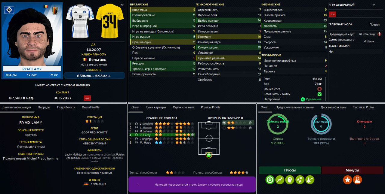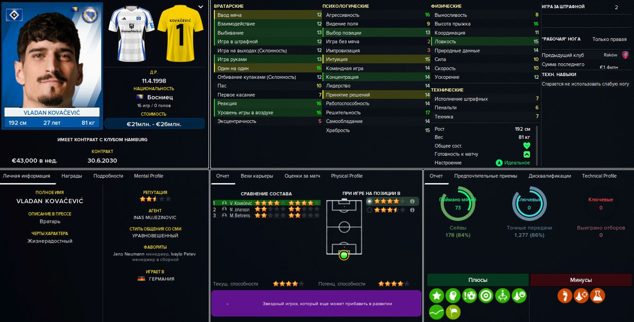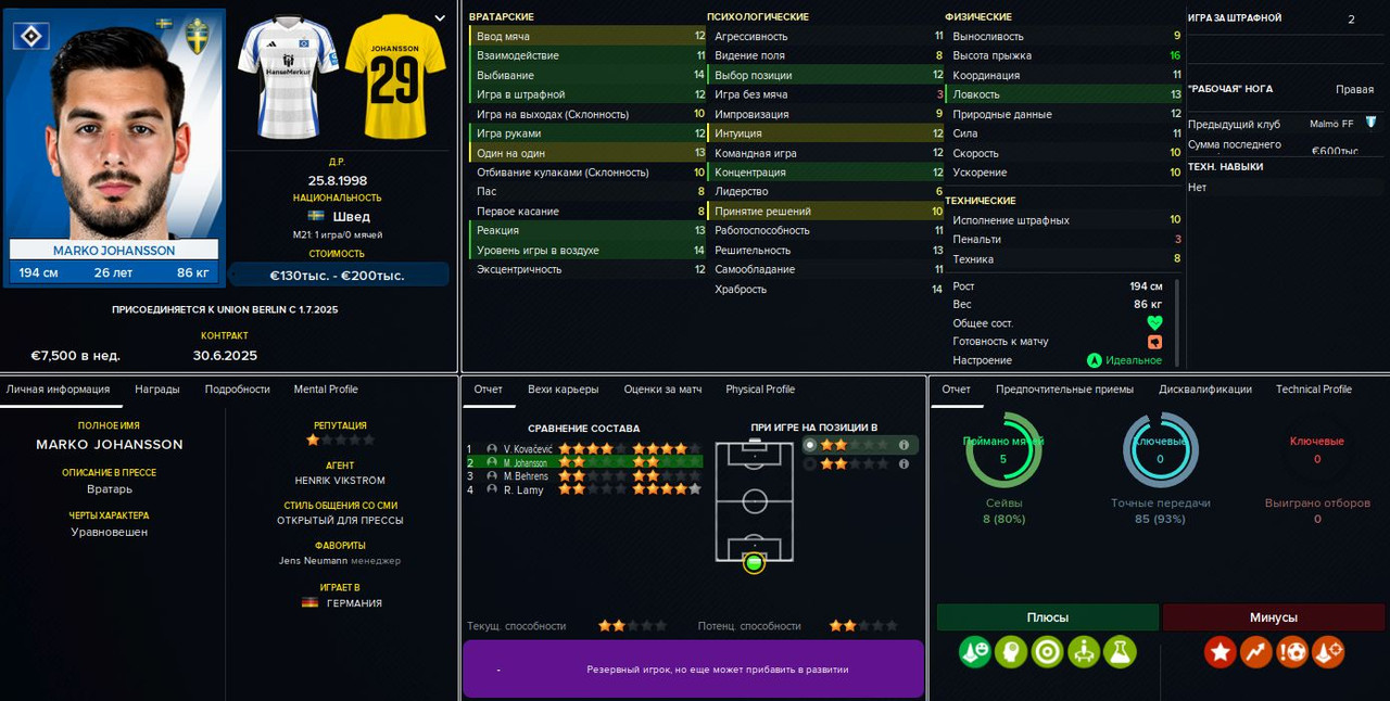 Выборка, конечно, не ахти (учитывая склонность FM завышать рейтинги голкиперам в любых «сухих» играх), но против «Гладбаха» бельгиец действительно провёл шикарный матч, а в остальных просто не допускал ошибок и выглядел увереннее того же Юханссона. С учётом возраста — уже очень и очень здорово.