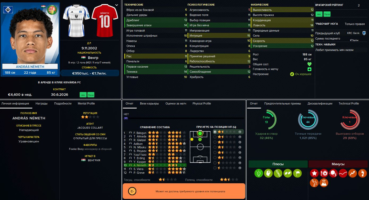Андраш НЕМЕТ («Кишварда», Венгрия), 38(2) игр, 3446 минут, 12+7 (10.70 xG, 4.70 xA), оценка 6.89. В чемпионате Венгрии получил достаточно игрового времени и даже поднял решительность на один пункт — это всё, что он развил за сезон.