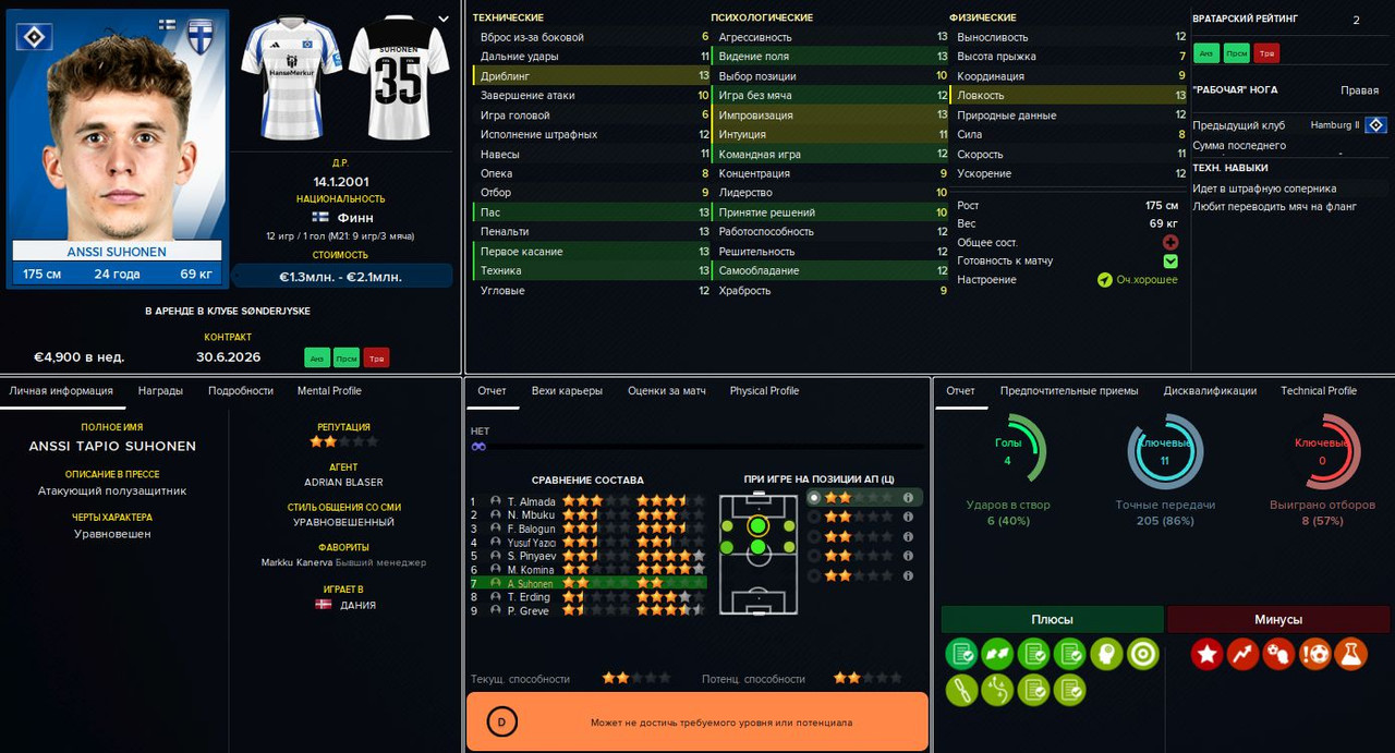 Ансси СУХОНЕН («Сённерйюск», Дания), 7(4) игр за полгода, 623 минуты, 4+2 (3.77 xG, 1.08 xA), оценка 7.03. Как и Микельбрансис, играл регулярно, да ещё и хорошо, но видимого прогресса не добился.