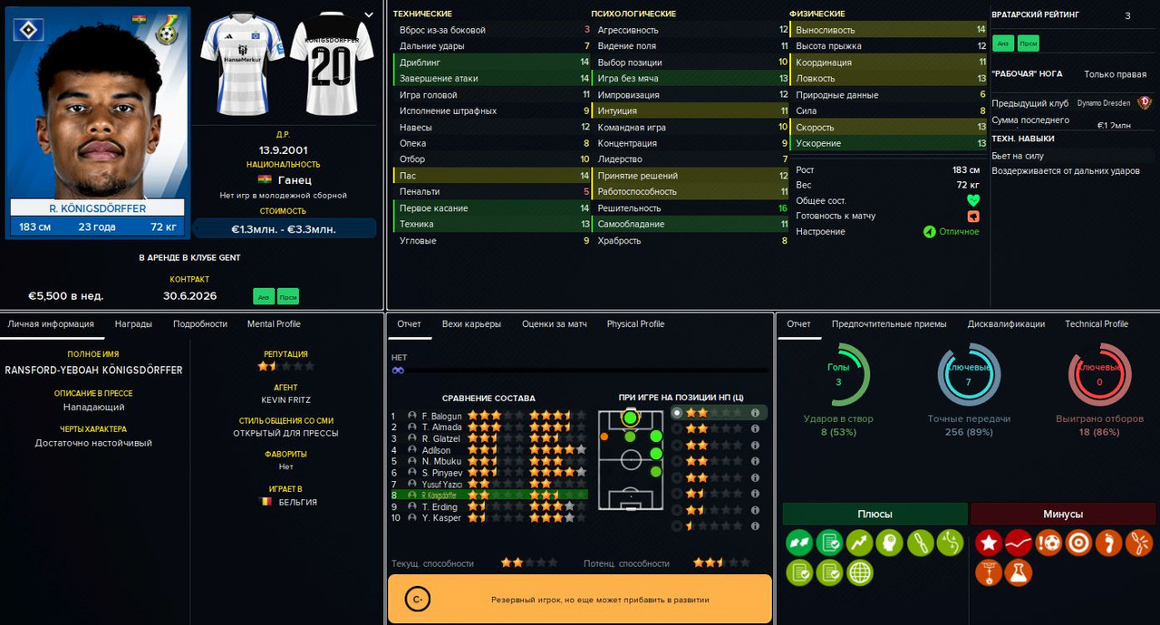 Рансфорд-Йебоа КЁНИГСДЁРФФЕР («Гент», Бельгия), 4(24) игры, 3+0 (3.06 xG, 0.44 xA), оценка 6.71. Ни во второй Бундеслиге годом ранее, ни в Бельгии у ганца проявить себя не получилось.