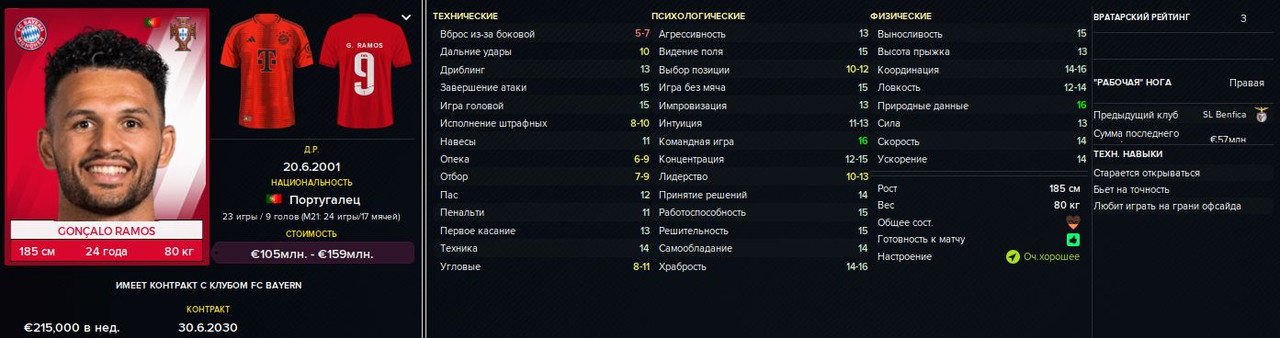 22(12) игры, 1794 минуты, 9+4 (7.01 xG, 4.04 xA), 2 из 2 пенальти, 1.81 прх/90, 1.71 отб/90, 1.20 обв/90, оценка 6.99.