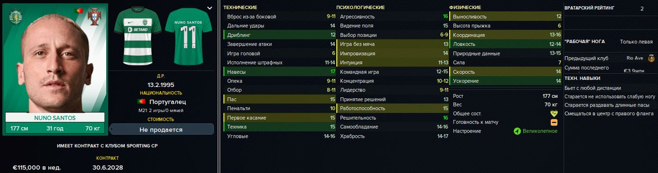 У лиссабонского клуба очень опытная команда (в старте вышло аж восемь игроков 30 лет и старше). Тут и знакомые немецким любителям футбола Андре Силва и Марко Фридль, и попылившие в Англии колумбийцы Санчес и Лерма, и японец Морита, и самый высокооплачиваемый игрок «Спортинга» — Нуну Сантуш, и, конечно же, вот эта легенда. Нет, глаза вас не обманывают: португальцы реально слетели с катушек и отвалили 81 миллион евро за почти тридцатилетнего игрока! Забавно, что капитаном и вице-капитаном при этом числится относительная молодёжь: Эдуарду Куарежма и Филипе Релваш соответственно. Рубен Аморим этим летом возглавил «Рому» (и, между прочим, пока лидирует с ней в Серии А). «Спортингом» теперь руководит 48-летний Нуну Манта Сантуш — лучший тренер второго португальского дивизиона сезона 2024/25, который вытащил «Фейренсе» в вышку и занял с ним 11-е место.