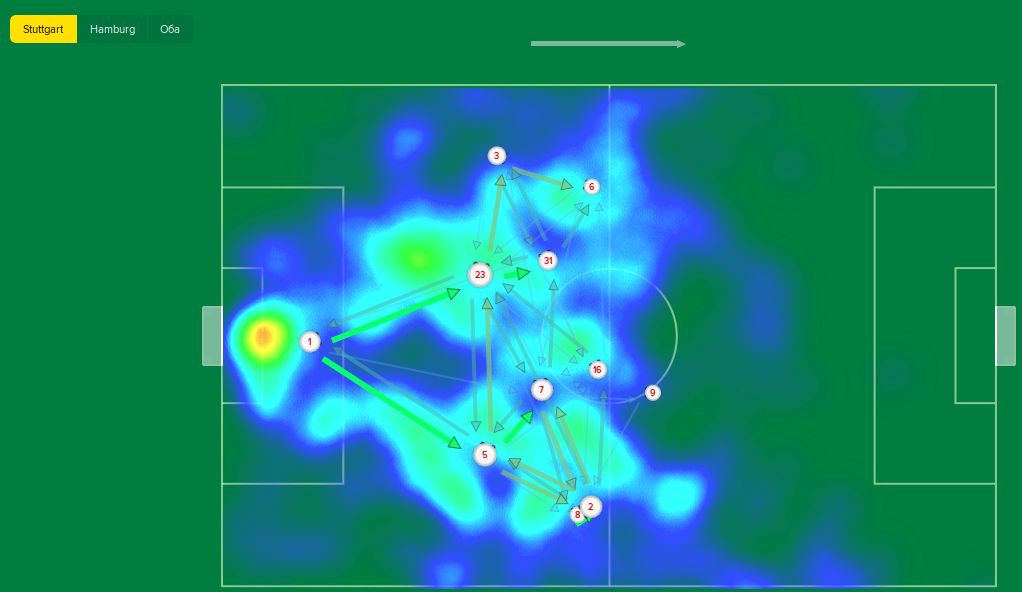 Хозяева в кризисе: всего одна победа в последних двенадцати встречах (хотя таблица xG и показывает, что им не особо везёт). О вообще чём говорить, если ваш лучший пока бомбардир — опорник с четырмя голами, а ваш главный форвард отличился лишь дважды. Сама игра вышла скучнейшей. Львиную долю из девяноста минут «Штутгарт» катал мяч на своей половине без какого-либо намёка на обострение. И это притом, что они оказались в роли догоняющих уже по ходу первого тайма: Пиняев слева покатил поперёк вдоль границы штрафной, Кастильо вроде бы потерял мяч под прессингом, но тут же выцарапал его обратно и откинул под удар Кнауффу, который мощно пробил в касание. В концовке «швабы» попытались изобразить что-то вроде навала, но кроме трёх дальних попыток (одна из которых — на счету подключившегося на стандарт голкипера) и неточного удара Загаду головой после после углового ничего добиться не смогли.
