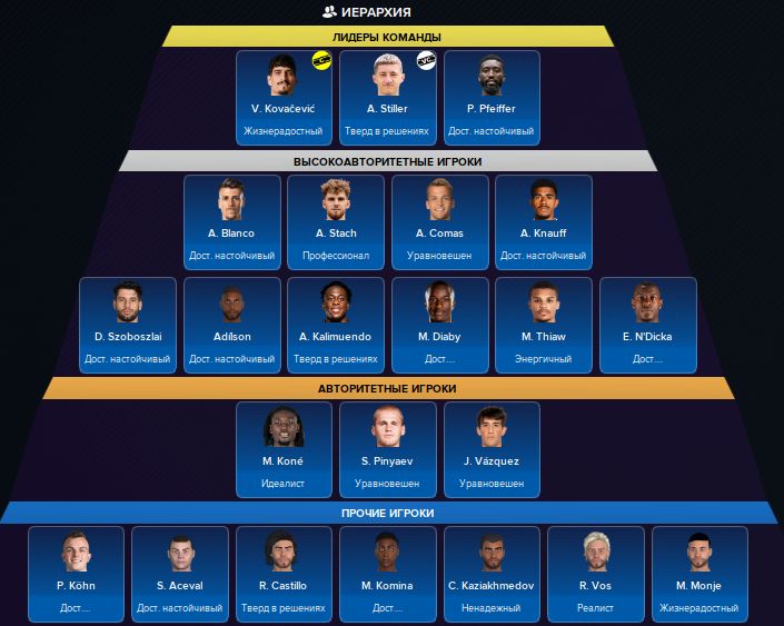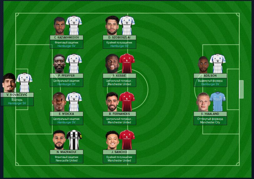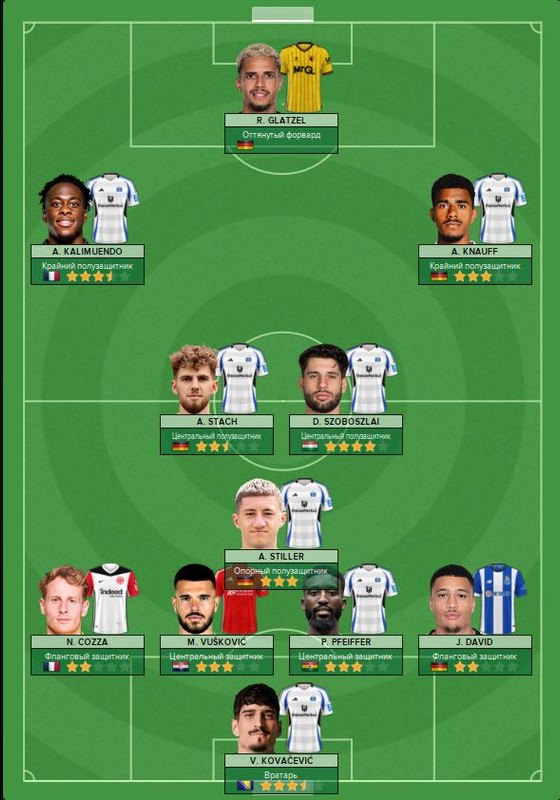 Самая спорная фигура здесь — Вушкович: выходы хорвата в центре обороны за четыре сезона можно пересчитать по пальцам одной руки, да и в полузащите я бы оставил максимум в качестве запасного. Скорее «за выслугу лет» место на левом фланге обороны получил и Козза: он никогда не был ни первым выбором, ни самым ярким игроком на этой позиции. Стаж его конкурентов (Винья, Лунн, Васкес) исчисляется сезоном-полутора, но среди них я бы предпочёл датчанина. В остальном всё адекватно. Альтернатив Ковачевичу, Пфайфферу, Штиллеру, Собослаи и Глацелю я не вижу. Штаха при желании можно заменить на Рейса. На флангах атаки выбор самый сложный: любые двое из Калимуэндо, Кнауффа, Пиняева, Диаби и Мбюкю будут уместны. В пару к Пфайфферу я бы поставил Ндика или Тшау.