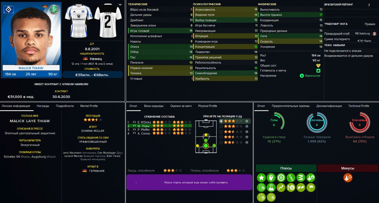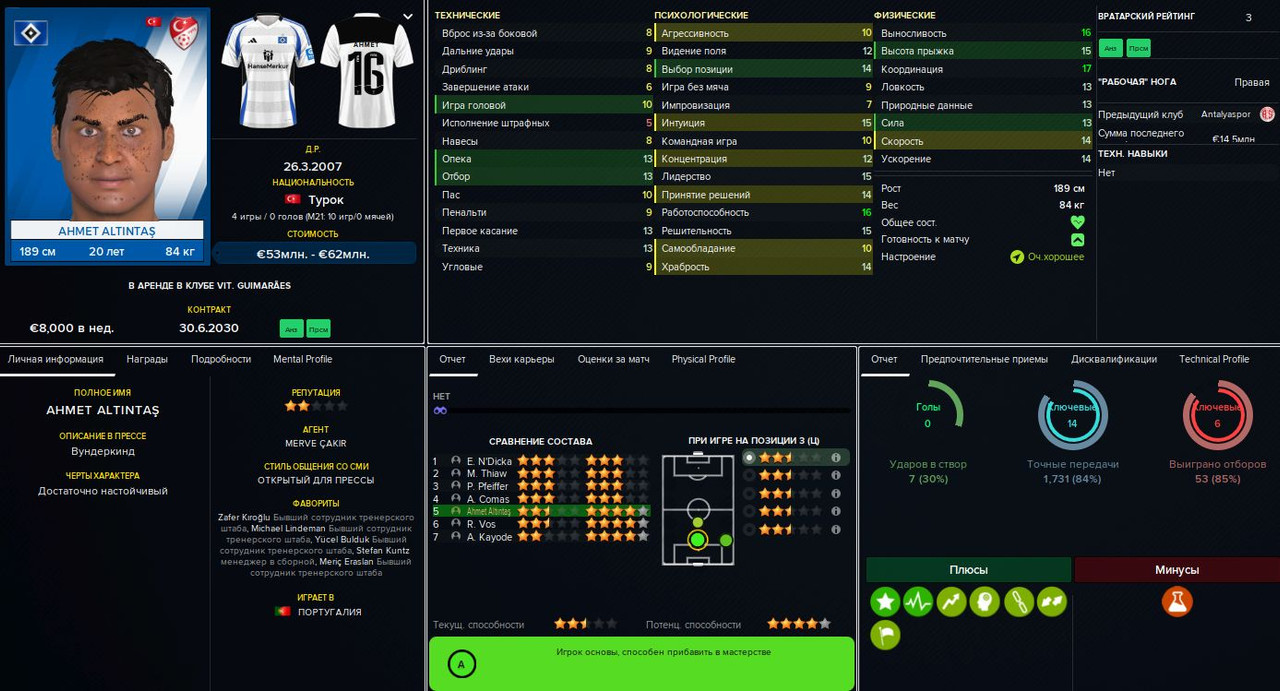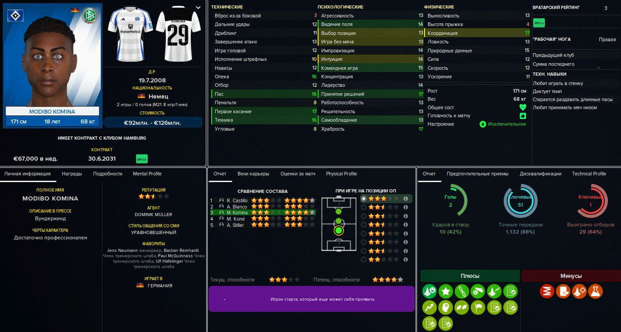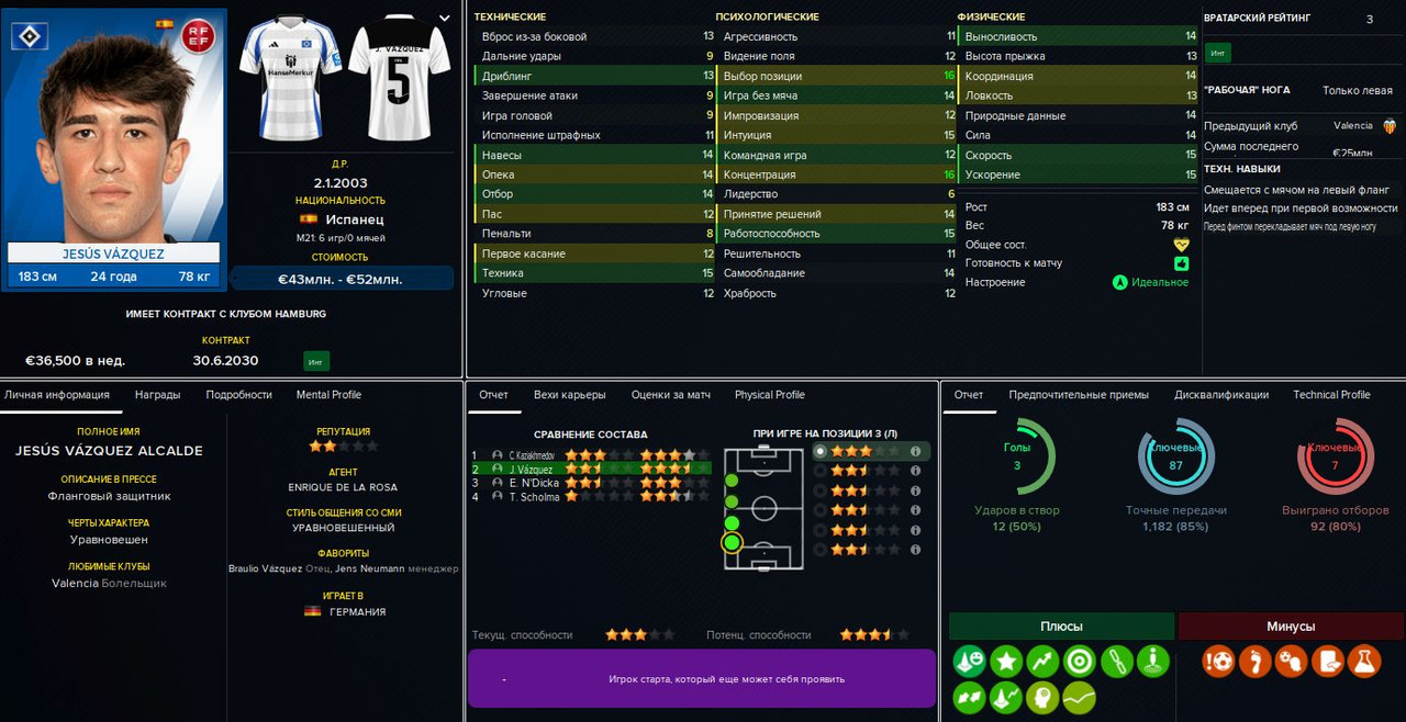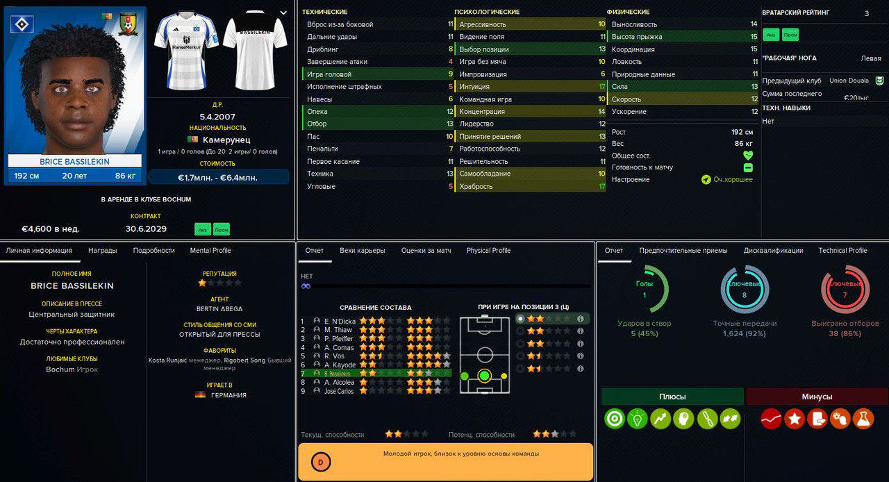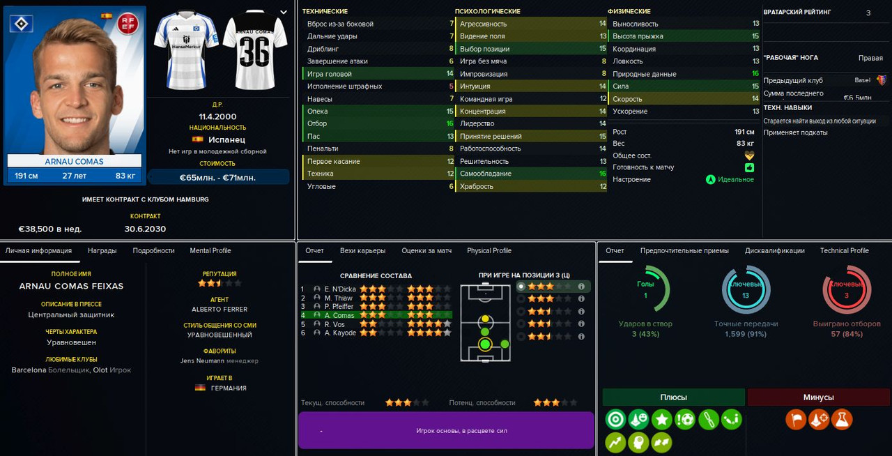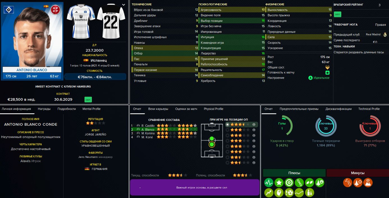 Уроженец Гамбурга с испанскими корнями. С таким ростом перспективы для игры в центре обороны у него сомнительные, так что будем качать пас и переквалифицировать в опорника-разрушителя — там его отбор и командная игра придутся как нельзя кстати. Немного напрягает нестабильность и любовь к фолам, но зато характер у парня неплохой.