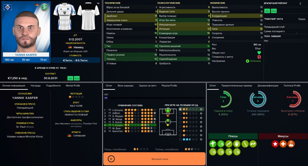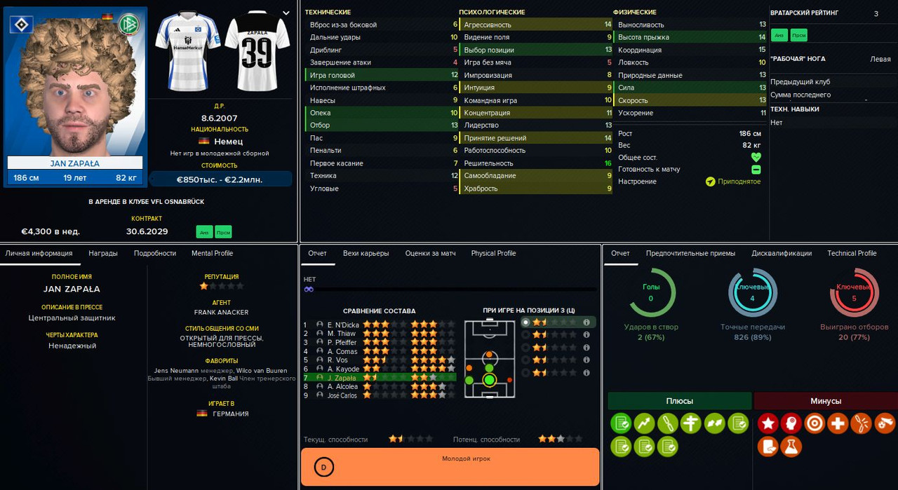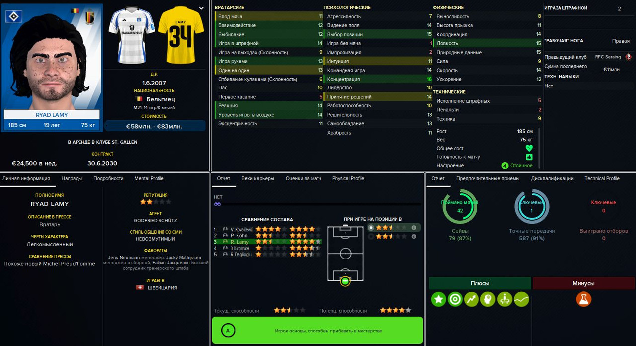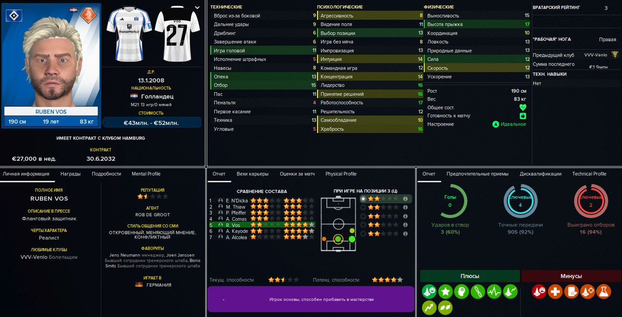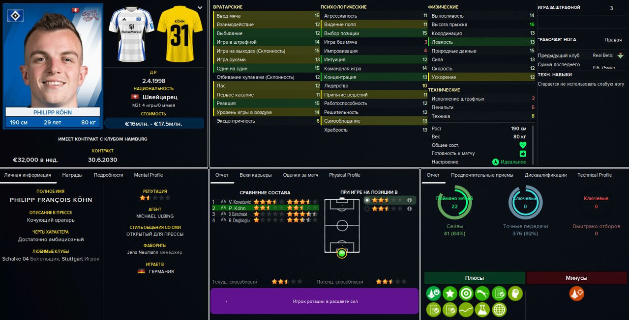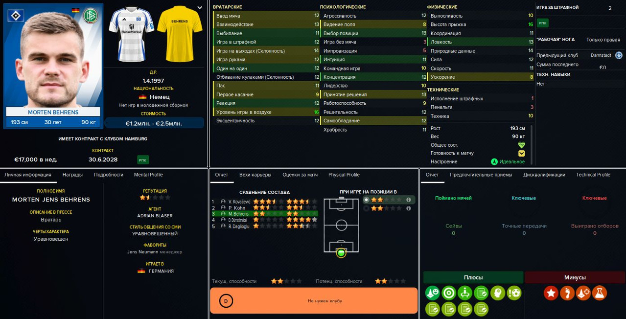 Уроженец Хольштедт-Рейна (не нашёл, где это). Характер у парня неплохой, реакция тоже, да и по основным вратарским скиллам критичных просадок нет. Но вот нестабильность для голкипера — это прямо-таки целая поварёшка дёгтя.