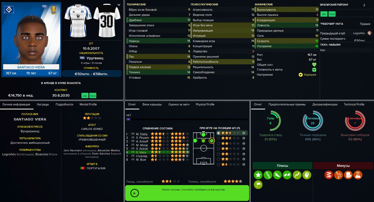 Сантьяго ВИЕРА («Боавишта», Португалия), 28 игр, 2220 минут, 8+1 (7.29 xG, 3.16 xA), 2.19 обв/90, оценка 6.91. «Боавишта» тоже выступила хуже ожиданий. Вряд ли стоит винить в этом уругвайца, который, судя по оценке, провёл достойный сезон и, к тому же, стал лучшим бомбардиром команды. Его также использовали в основном в качестве форварда, где Сантьяго не был максимально эффективен. Прогресс в навыках, как и у Палавесино, минимальный.