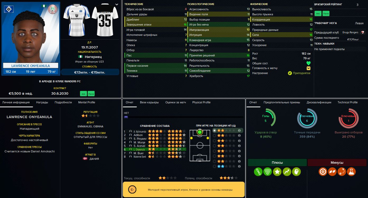 Лоуренс ОНЬЕАНУЛА («Раннерс», Дания), 20(1) игры, 1757 минут, 5+2 (3.37 xG, 1.22 xA), 11.53 вздх/90 (17% выиграно), 1.38 обв/90, оценка 6.72. Ещё одно блеклое выступление нигерийца в аренде. Таким макаром своего шанса в «Гамбурге» он рискует не дождаться.
