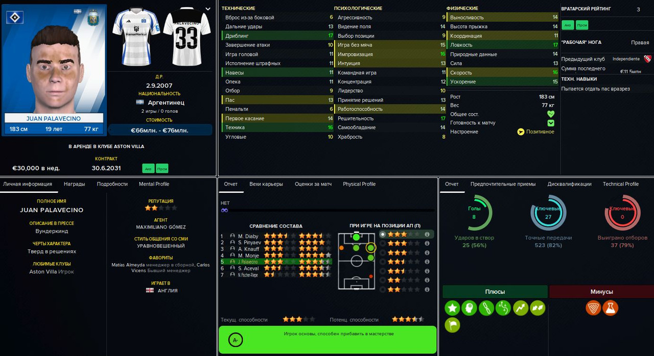 Хуан ПАЛАВЕСИНО («Астон Вилла», Англия), 32 игры, 2806 минут, 8+4 (6.91 xG, 3.43 xA), 1.70 обв/90, оценка 6.86. По какой-то причине англичане предпочитали использовать Хуана на острие атаки. Самому игроку аренда пришлась по душе, но эффективность оказалась сомнительной: «Вилла» осталась без еврокубков, а аргентинец особо не прибавил в навыках.