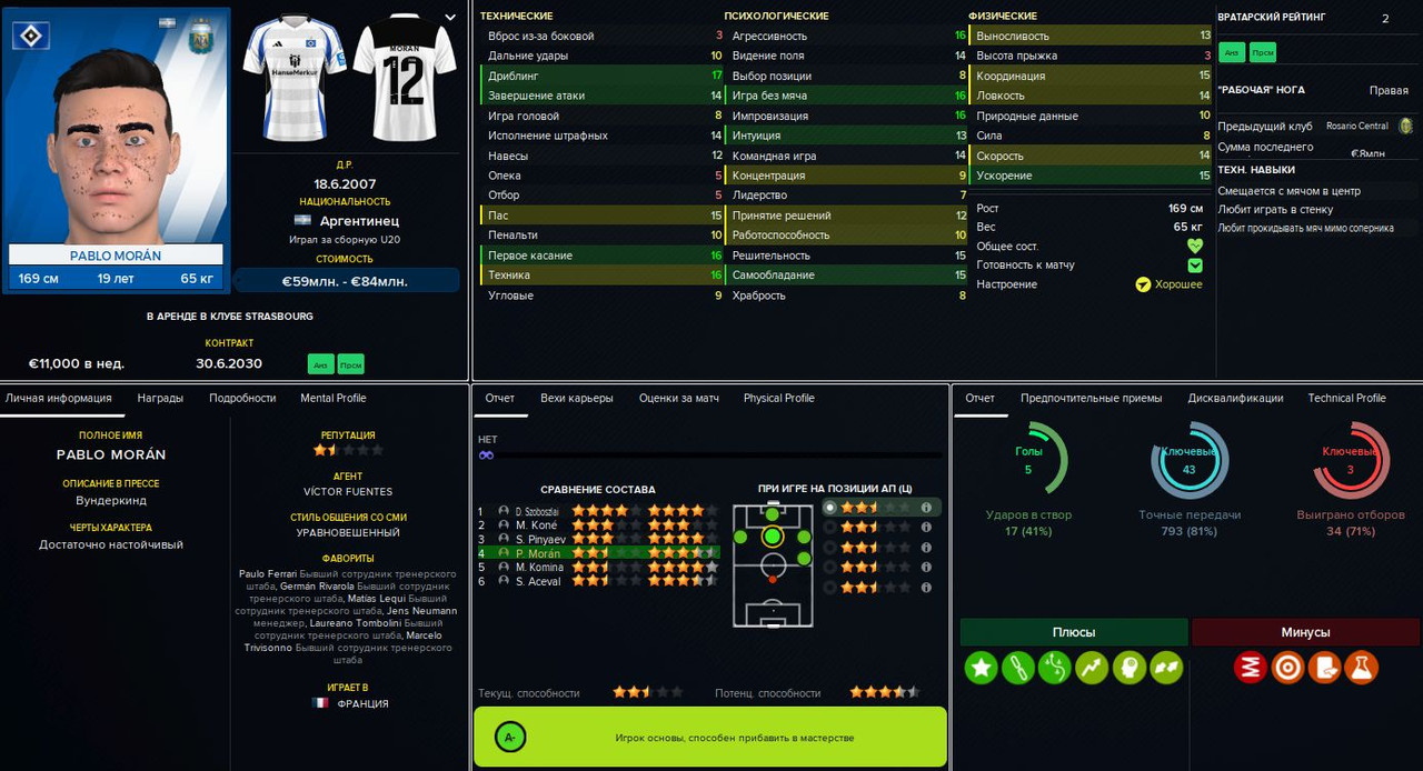 Пабло МОРАН («Страсбур», Франция), 31 игра, 2630 минут, 5+0 (4.55 xG, 3.80 xA), 2.43 прх/90, 1.16 отб/90, 2.19 обв/90, оценка 6.94. Весь сезон игравший выдвинутого плеймейкера аргентинец не отдал ни одной голевой передачи. С другой стороны, «Страсбур» вообще забивал мало (пять голов Пабло — третий результат в клубе, а его оценка — одна из лучших среди партнёров). Однако задачу на сезон — остаться в элитном дивизионе — эльзасцы выполнили, и это принесло в копилку «Гамбурга» дополнительный миллион евро по условию арендного соглашения. Более того, агентинца признали лучшим молодым игроком года во Франции.