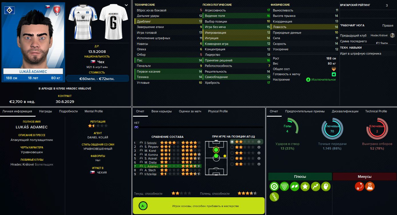 Лукаш АДАМЕЦ («Градец-Кралове», Чехия), 34(1) игры, 2538 минут, 4+6 (4.45 xG, 3.61 xA), 1.75 прх/90, 1.78 отб/90, 0.96 обв/90, оценка 7.02. Лукаш здорово помог родному клубу остаться в высшей лиге и поднял кучу атрибутов на единичку.
