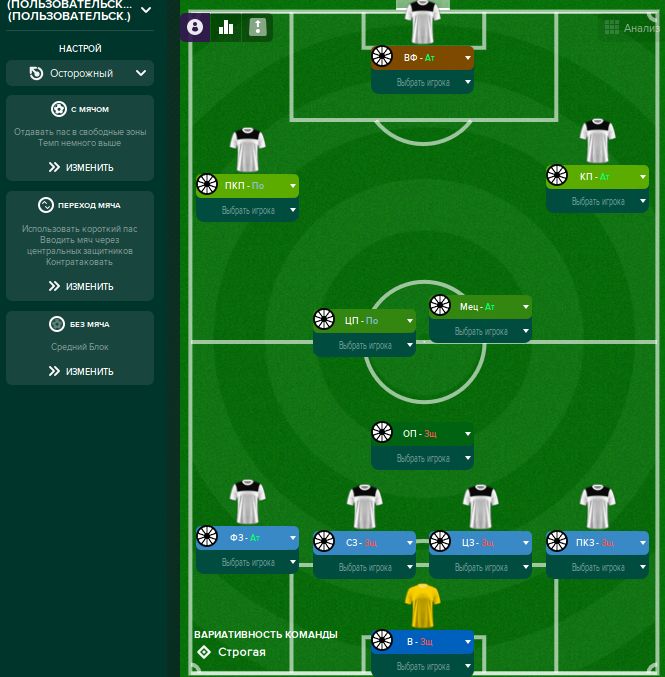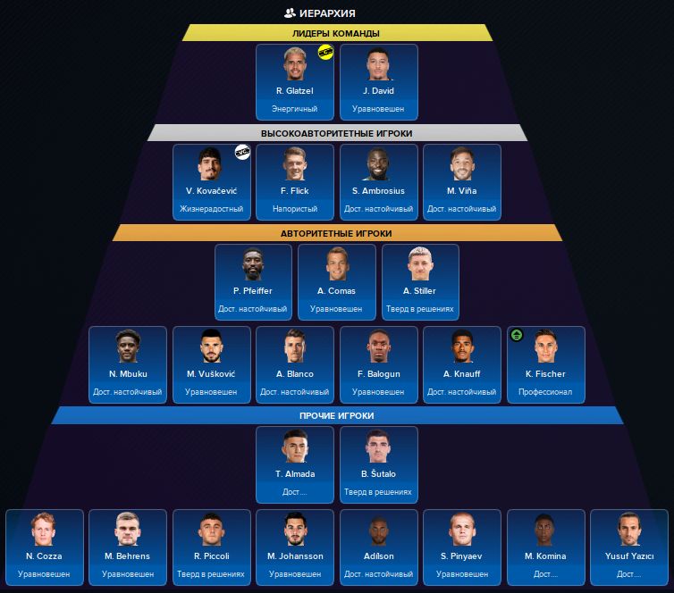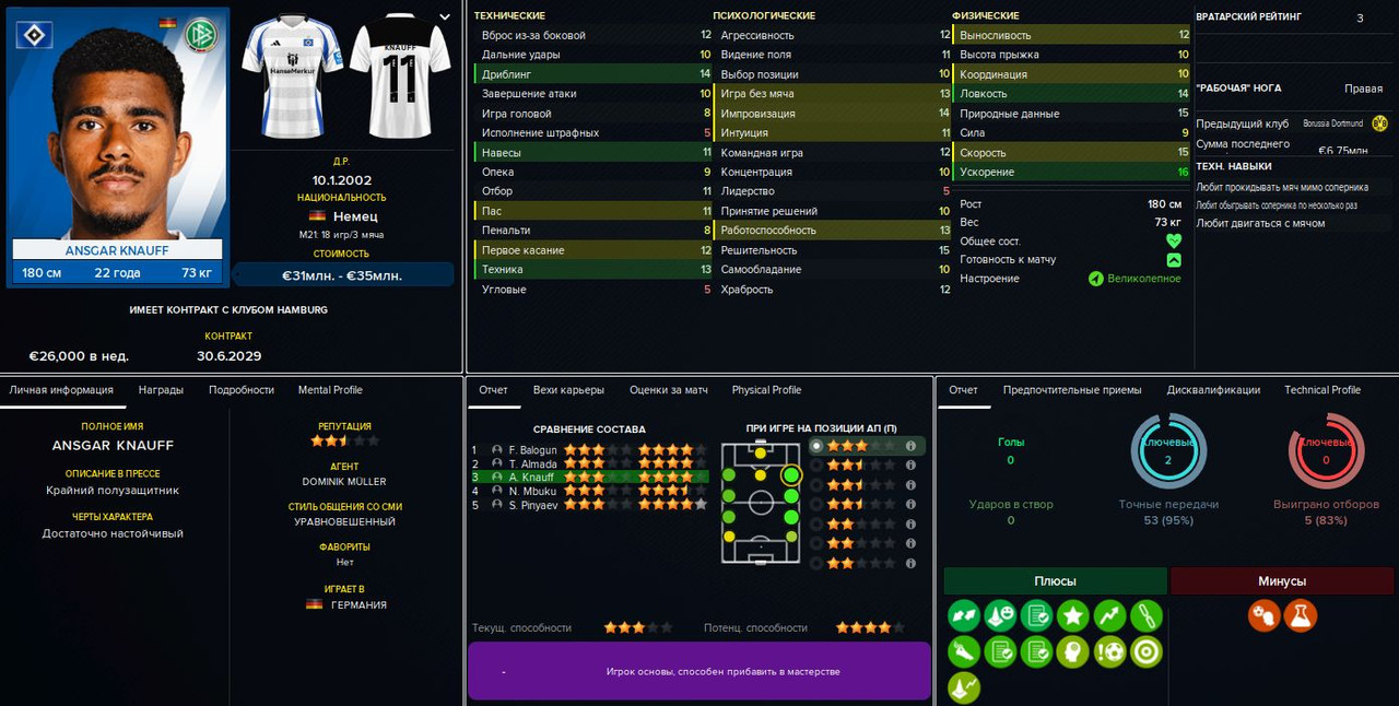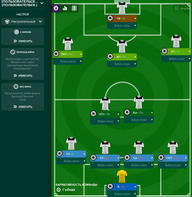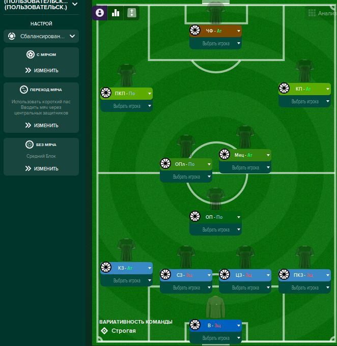 Базовой остаётся схема 4-3-3 (а также её более осторожный вариант с Балоганом или Мбюкю на острие). Это уже FM24, так что правому защитнику (Шутало/Амброзиус) можно выдать роль полуфлангового и, соответственно, развязать руки левому (Винья/Козза/Фишер). В центре поля можно варьировать роли: чистый разрушитель (Флик/Комас), статичный плеймейкер (Штиллер/Комина), «набегатель» в штрафную (Вушкович/Бланко) или классическая «десятка» (Юсуф/Альмада), которую можно передвинуть на позицию «под нападающим» в схеме 4-2-3-1. Справа в атаке — либо классический вингер (Кнауфф/Пиняев), либо левоногий Мбюкю. Слева — инсайд Балоган или ПКП-созидатель (Альмада/Пиняев).