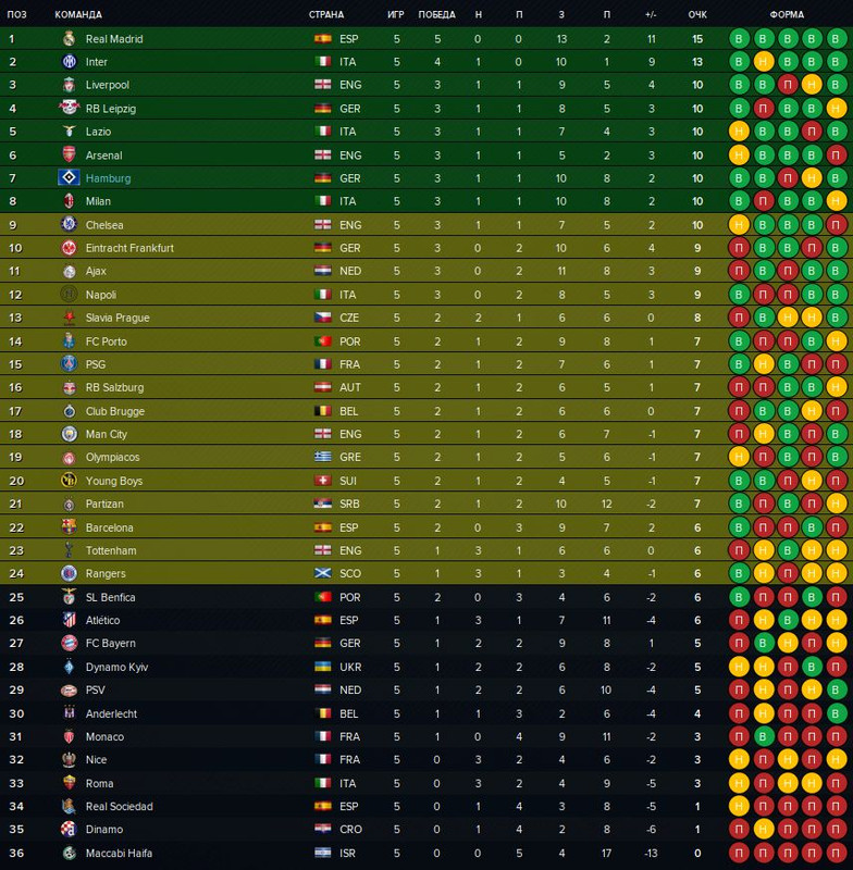 Турнирная таблица Лиги чемпионов после 5-го тура
