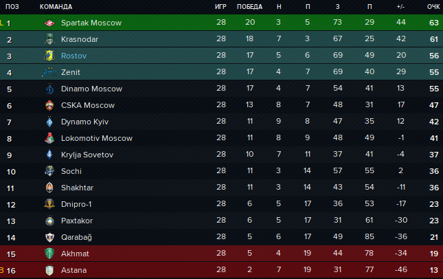 В таблице ситуация складывается крайне любопытная. Нас тут даже в претенденты на титул записали, но то всё же понты. Скорее всего, там уже пульку будут расписывать "Спартак" и "Краснодар", причём у "красно-белых" календарь явно выглядит попроще. А вот за бронзовые медали драка будет страшная, тут сразу четверо претендентов! Помимо нас, тут имеются московское "Динамо", "Зенит" (правда, уже без Сергея Богданыча Семака, уволили болезного) и "ЦСКА", на расстоянии друг от друга в 4 балла всего. Свой интерес есть и внизу. Не в плане "Астаны", казахов, увы, можно хоронить - не вывезли товарищи сезон с 1/16 финала Лиги Конференций и 1/8 финала Кубка СССР, на чемпионат сил уже тупо не осталось. За вторую путёвку вниз борьба та ещё, отчаянно норовят спихнуть друг друга "Днепр-1", "Карабах" (тоже без главного тренера), "Ахмат" и "Пахтакор". Все прочие подробности - на скрине ниже: