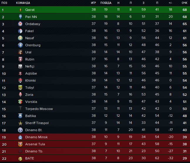 Как водится, в конце квартала заглянем и в Первую лигу. Главных претендентов за месяц до финиша трое на две путёвки в элитный дивизион - "Кайрат", "Пари НН" и по потерянным ещё "Ордабасы". Внизу же у "БАТЭ" и тбилисского "Динамо" шансов откровенно минимум на выживание, а вот ещё две путёвки вниз распишут между собой ещё два коллектива "Динамо" (из Минска и Батуми), а также тульский "Арсенал" и "Шериф". Подробности - на скрине ниже: