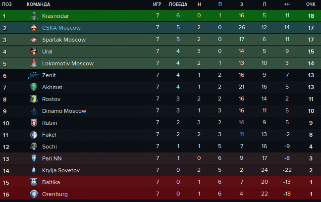 Ну и в таблицу заглянем, хоть там пока всё предельно тесно, но как бы почти половина первого круга позади. Мы идём неплохо, без поражений (что радует), любопытно видеть в еврокубковой зоне "Урал" на четвёртом месте. А вот "Зенит" стартовал с пробуксовкой, сейчас вроде бы нагнал основную группу, но всё равно непривычно видеть питерцев на шестом месте. Пожалуй, главное же разочарование на старте - "Крылья Советов"... Две нулевых ничьи и пять поражений с общим счётом 2:24 - это прям больно и отсутствуют ребята в зоне прямого вылета по одной простой причине: есть коллективы, кто в турнирном плане стартовал хуже. Все подробности - на скрине ниже: