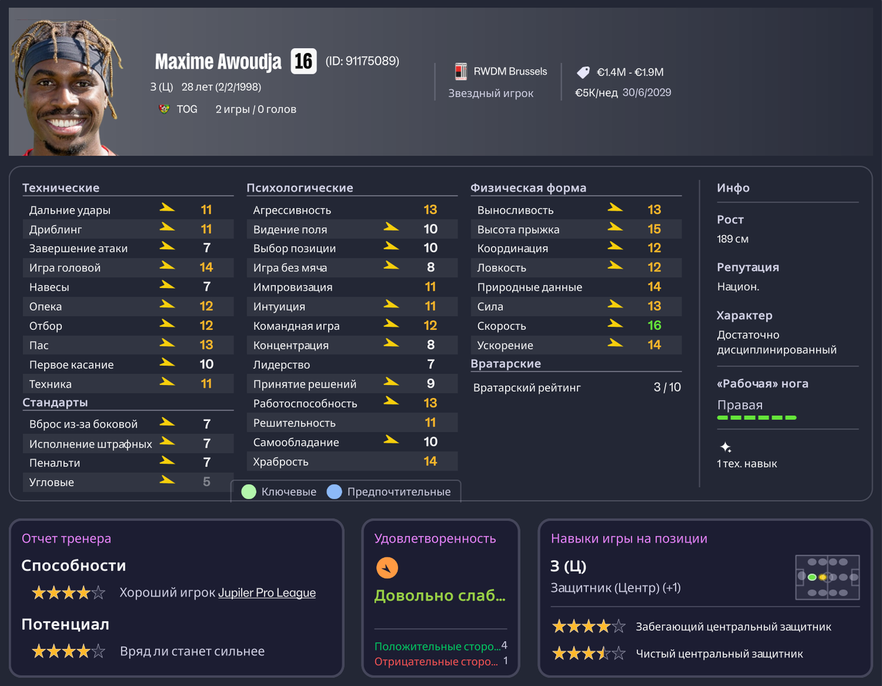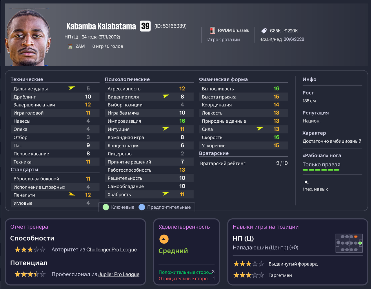 Кабамба Калабатама, 24 года, Замбия \ Норвегия. Лучший вариант среди нападающих из-за того, что хоть чем-то выделяется. Обычно нападающие для моего уровня имеют предел в скиллах (12-13), а тут очень быстрый, выносливый и прыгучий. Топовый вариант для меня - это как раз такой тип нападающих, который мне нравится. Да, у Кабамбы во всем проблемы, но завершение 12 пойдет, ладно. Последним клубом был Милсами. Бесплатный трансфер.