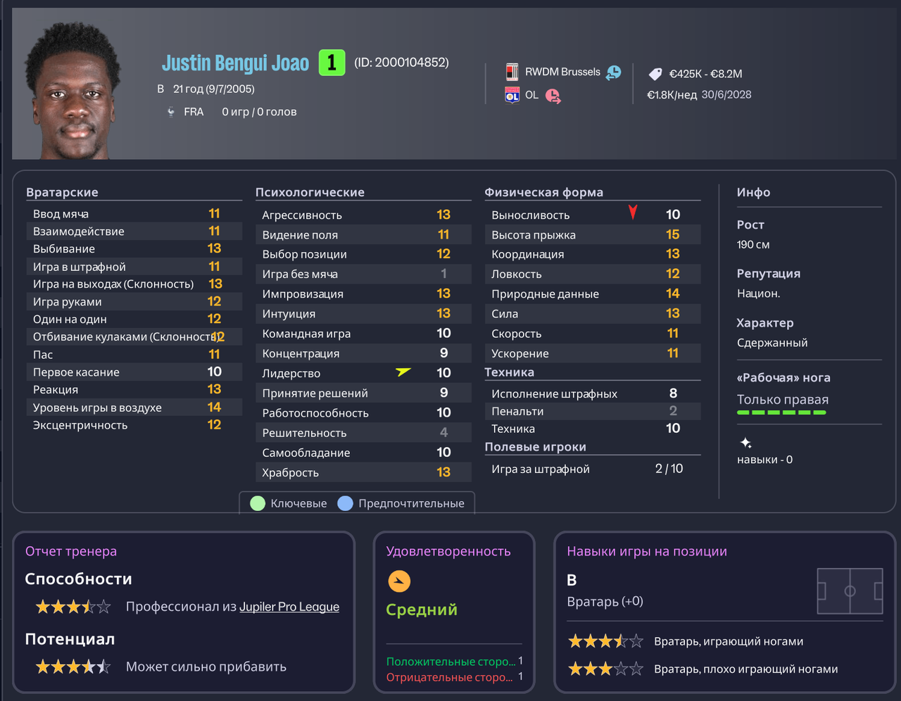 Джастин Бенги Жоао — 25 матчей в старте, 28 пропущенных голов, 8 сухих матчей, средняя оценка 7.12.