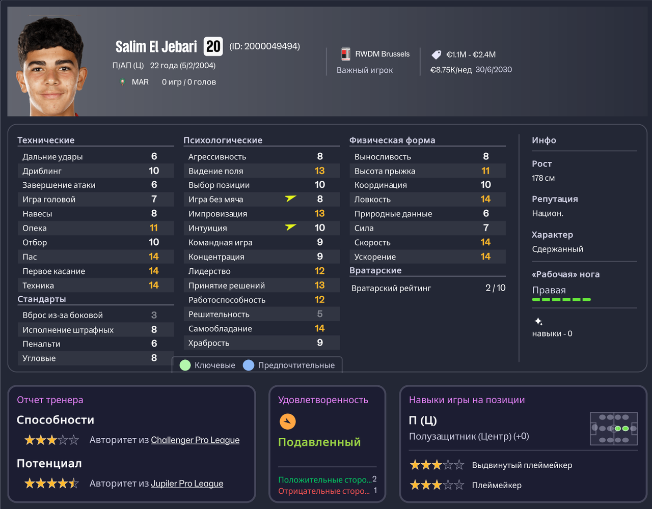 Салим Эль Джебари, 22 года, Марокко \ Испания. Интересный футболист, но скорее всего трансферная ошибка. За такого можно было и не платить. Но ладно, посмотрим. Возможно, заиграет и переубедит меня. Куплен из Атлетико Мадрид за 48 тысяч.