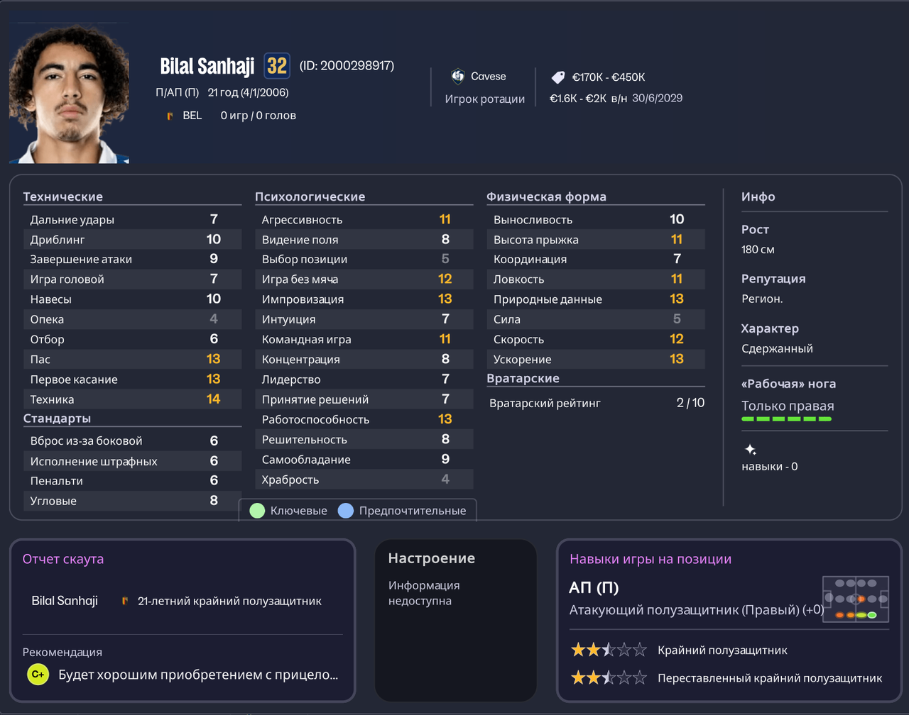- Биляль Санхаджи перешел в "Карезе" за 45 тысяч. Удивительно видеть такого реального футболиста. Обычно я вижу таких регенов: игрок фланга, но без каких-либо технических навыков, при этом имеет пас, но не видит поле. Спасибо итальянцам.