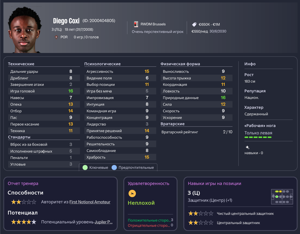- Диего Кокси, 19 лет, Португалия  Ангола. Молодой защитник с хорошим стартовым набором скиллов. Очень надеюсь на его развитие, но стоимость говорит о другом. Бесплатный трансфер, последним клубом был Спортинг.