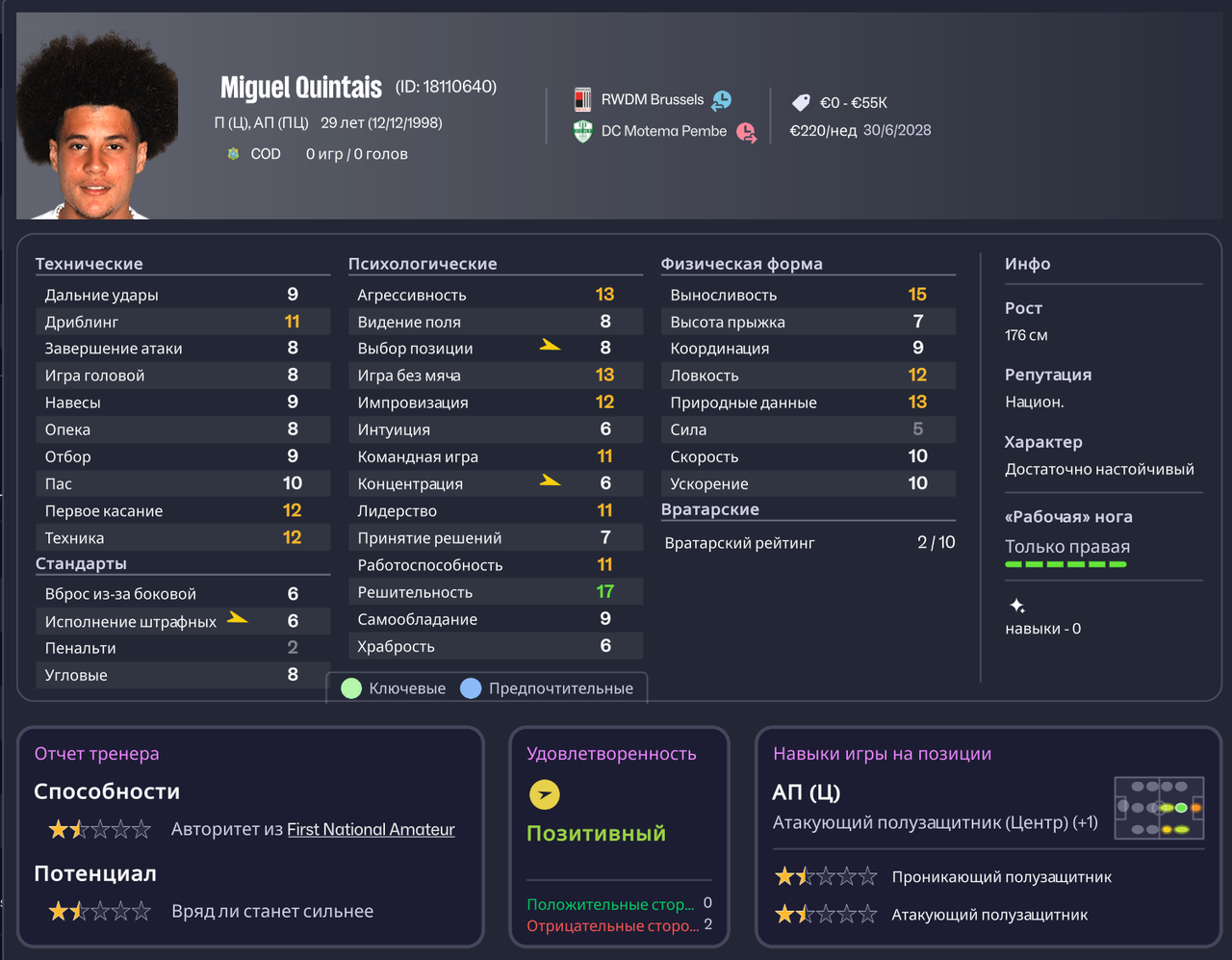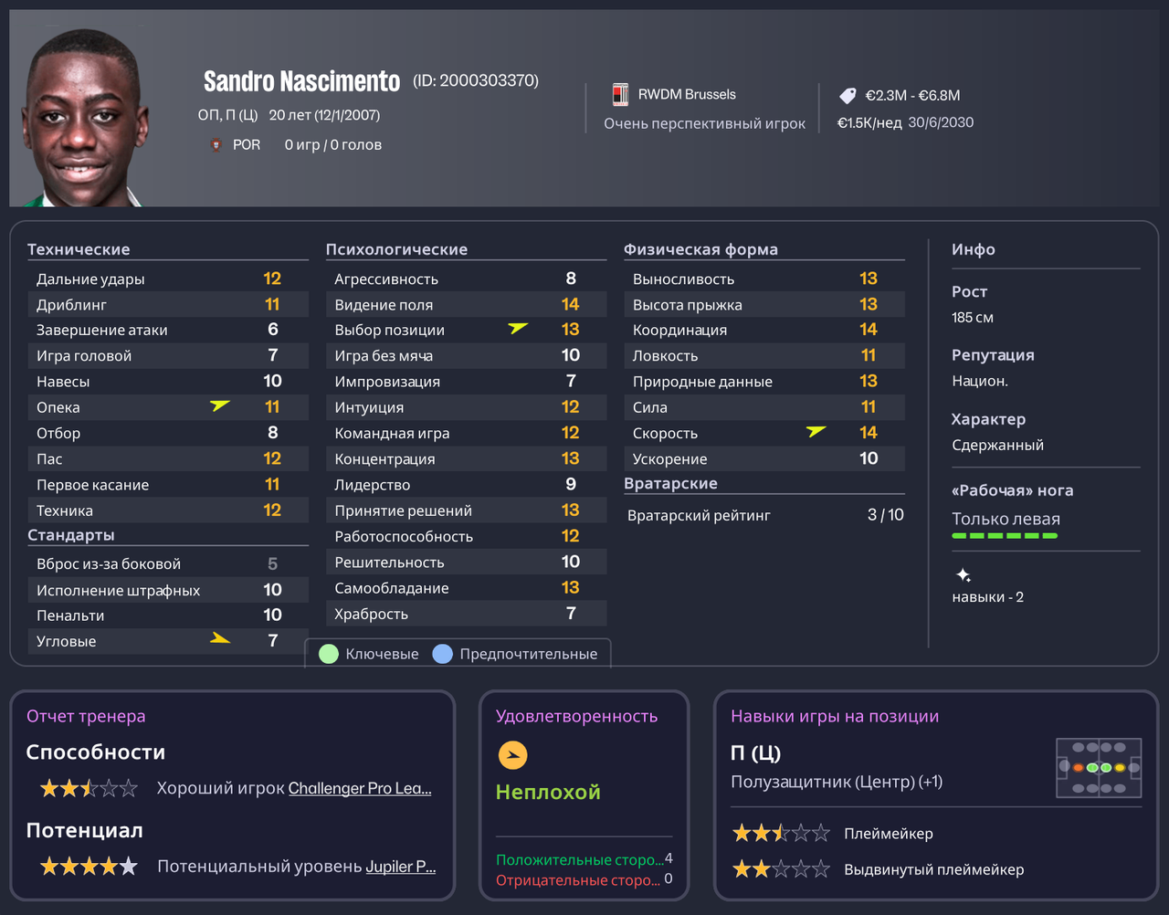- Сандро Насименто, 20 лет, Португалия  Ангола. Наверное, самый потенциально полезный из Португальской Тройки(Кокси, Сантос и Насименто). Выглядит достаточно неплохо, но не хватает паса. Если смогу прокачать пас до 13, то Сандро точно будет игроком ротации(минимум). Также рассматриваю вариант с тем, чтобы сделать из него крайнего защитника, но пока будет тренировать его как игрока центра поля. Бесплатный трансфер. Последним клубом был Спортинг.