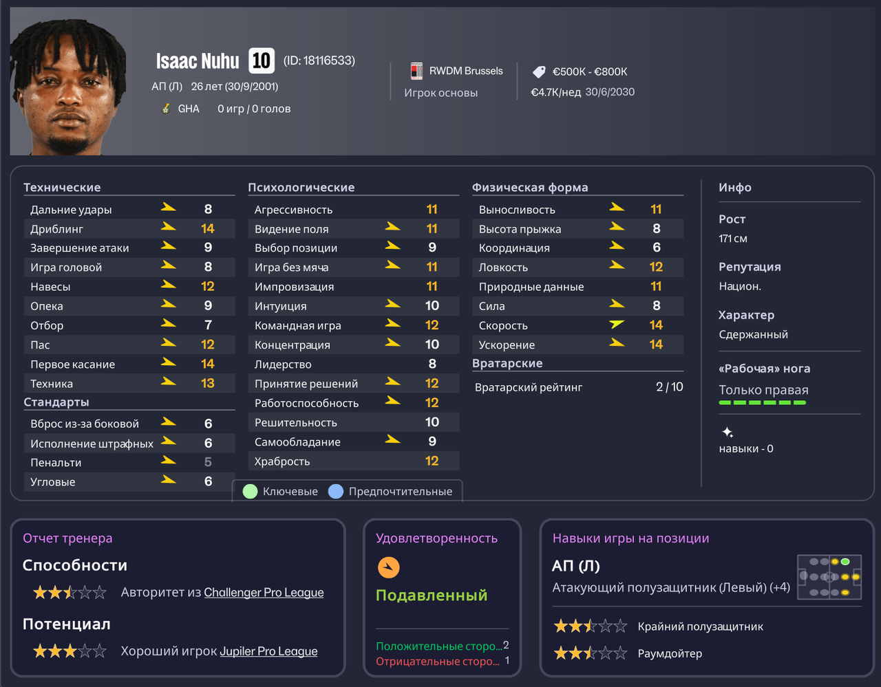 - Исаак Нуху, 26 лет, Гана  Бельгия. Не такой хороший, как Лютин, но зато является воспитанником бельгийских клубов, что помогает при заявке на матч (в чемпионате Бельгии в заявке на матч(11+9) должно быть минимум 6 воспитанников бельгийского футбола). Обладает хорошей скоростью и дриблингом. Что еще нужно для игрока ротации в бельгийском середняке? Бесплатный трансфер. Последним клубом был Эйпен.