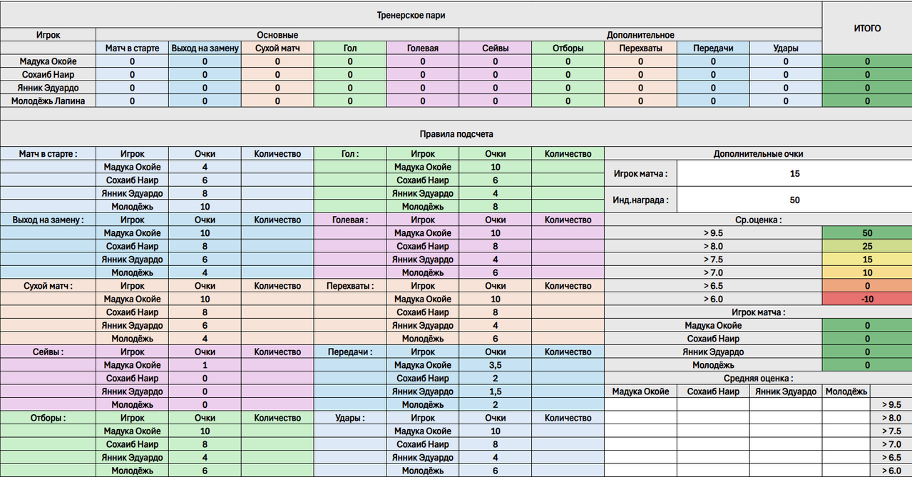 Вутерс одобрительно кивнул : - «Предлагаю систему баллов. За чистые сухие ворота Окойе - 3 очка. За голевые передачи Наира - 2. За голы Эдуардо - 5.»