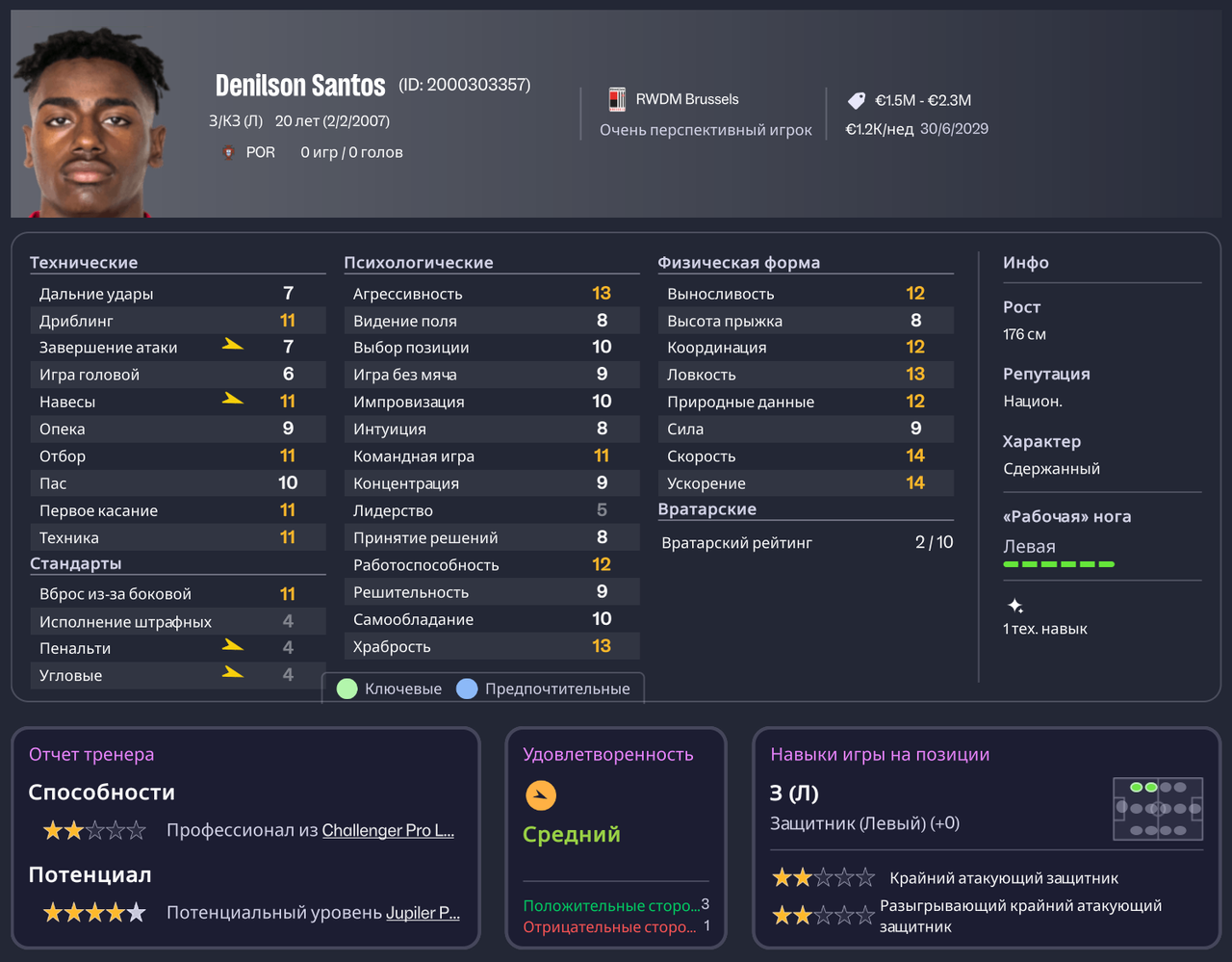- Денилсон Сантос, 20 лет, Португалия  Кабо - Верде. На данный момент выглядит интересно, есть несколько звездочек потенциала. Наверное, если бы с 18-ти лет он попадал в стартовый состав, то выглядел бы лучше, но самое важное время утеряно, а значит, развиться полностью он скорее всего не сможет. Но есть шанс продать его за миллион, а то и больше. Бесплатный трансфер. Последним клубом был Спортинг.