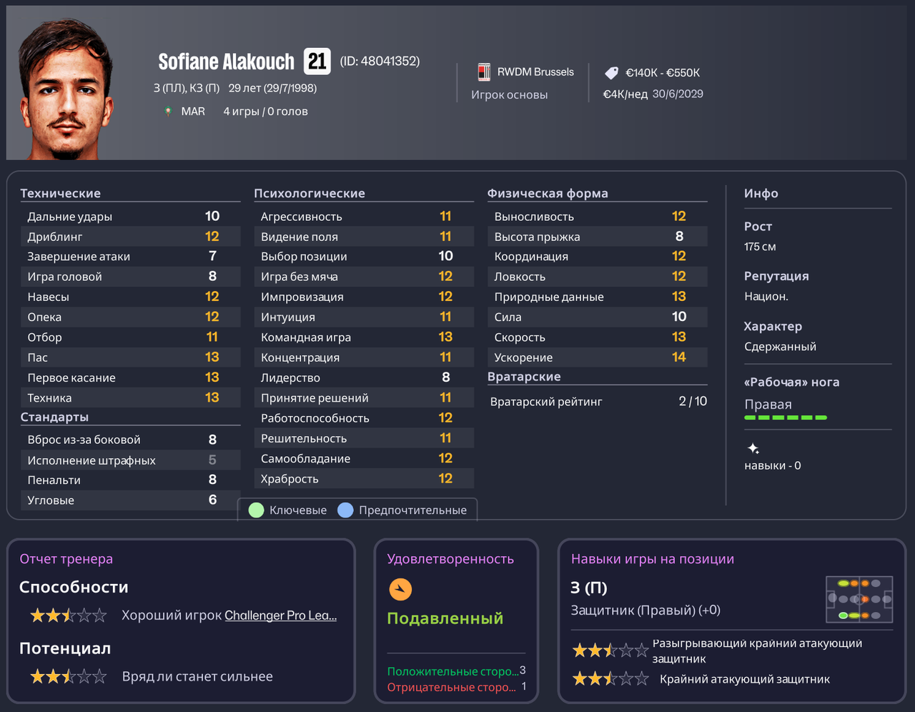 - Софьян Алакуш, 29 лет, Марокко  Франция. Известнейший универсал. Помню его по ФМ 18-20, он был еще лучше. Какое-то время его путали с Аклиушем. Примерно такой же, как пришедший в прошлом году Дагба, тоже на правый фланг. Но я его рассматриваю как игрока подмены для Мурсии, если у того не получится. Думаю, что полезно иметь в составе такого игрока. Бесплатный трансфер. Последним клубом был Левадиакос.