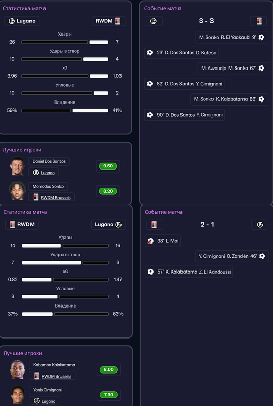 Матч имени Заяда Эль Кандусси. А ведь именно он был первым игроком достаточно хорошего уровня, который пришел к нам в Моленбек. И при этом Заяд является воспитанником нашего клуба. Наверное, в еврокубках были матчи, в которых один игрок отдавал 4 голевые передачи, но для Моленбека этот матч точно войдет в историю! Мы проходим дальше, зарабатываем деньги и выходим на Лугано из Швейцарии.